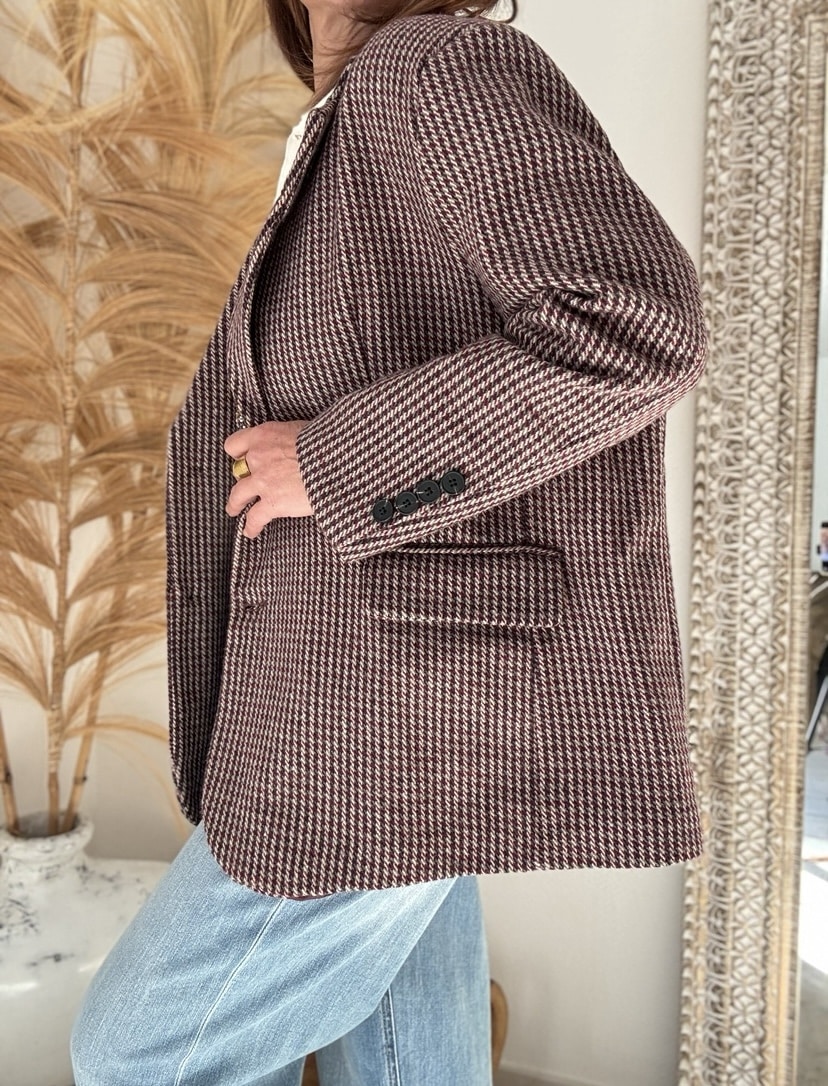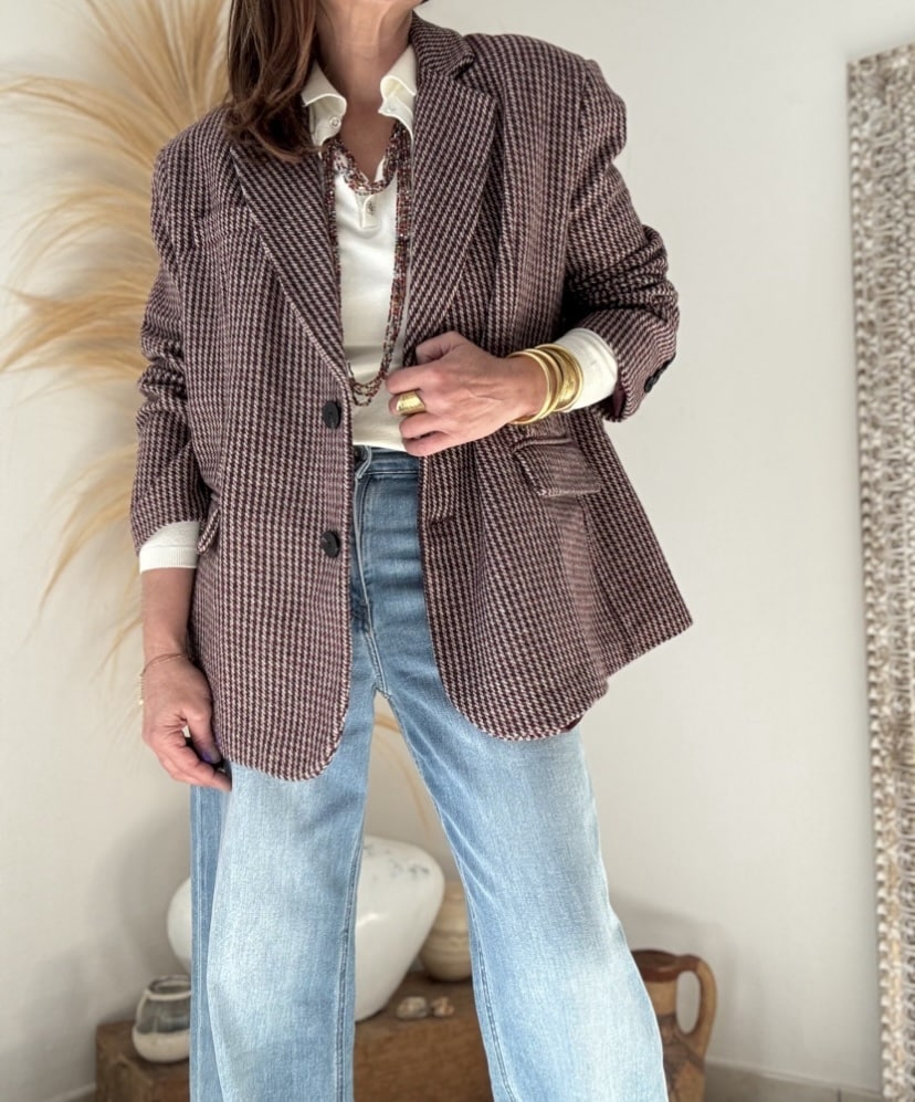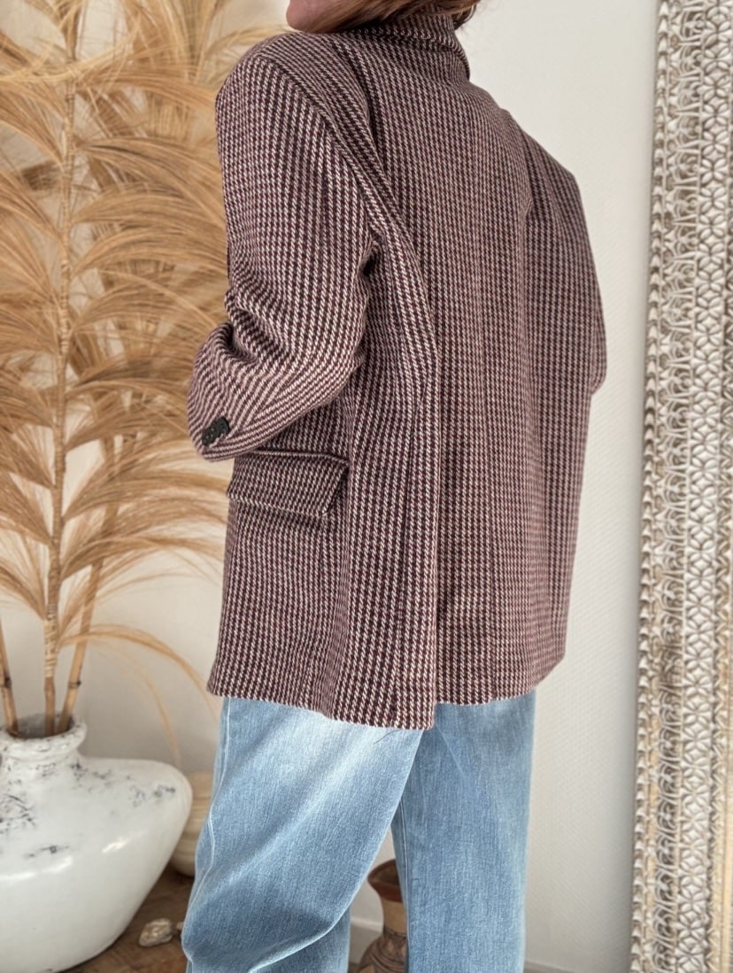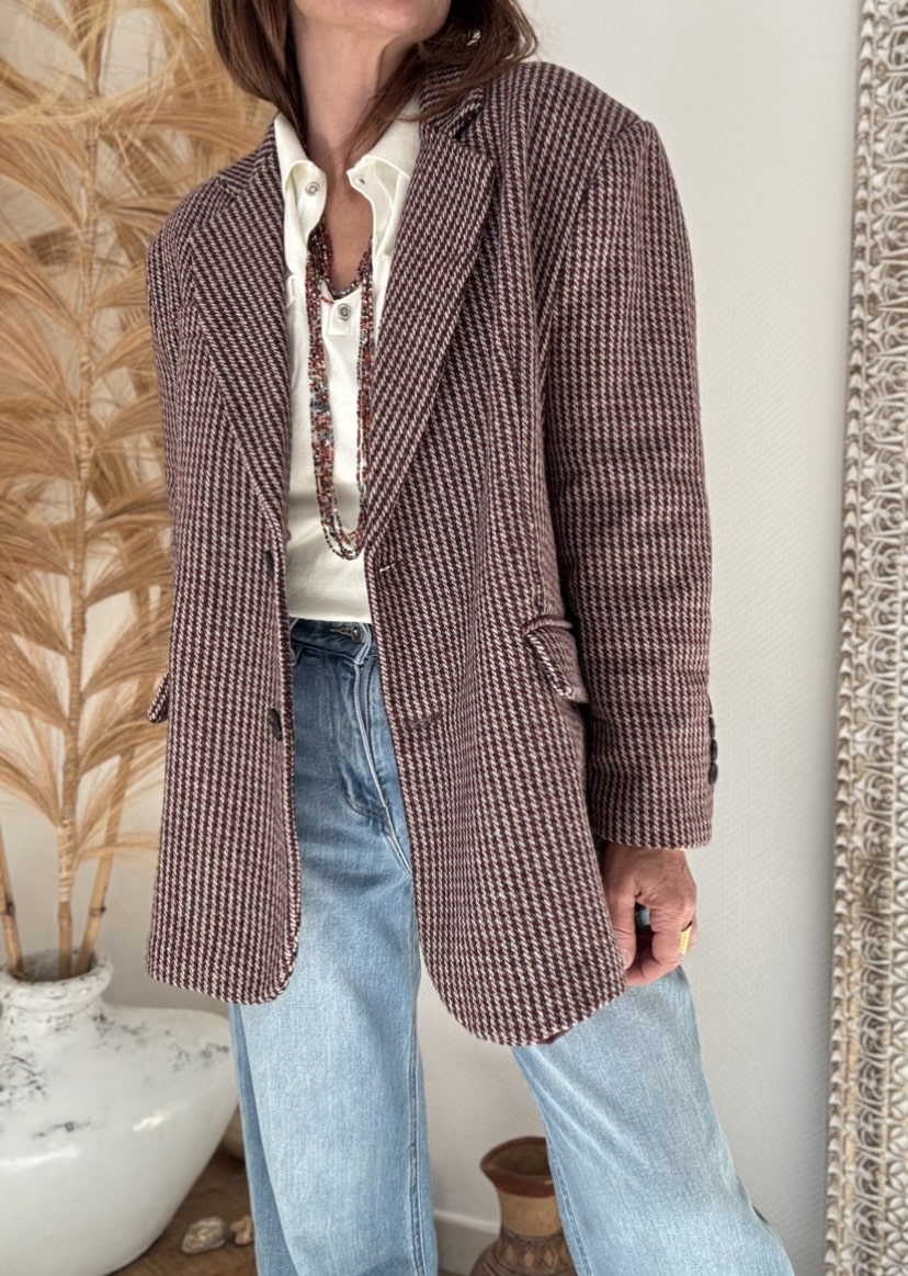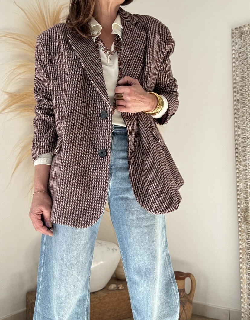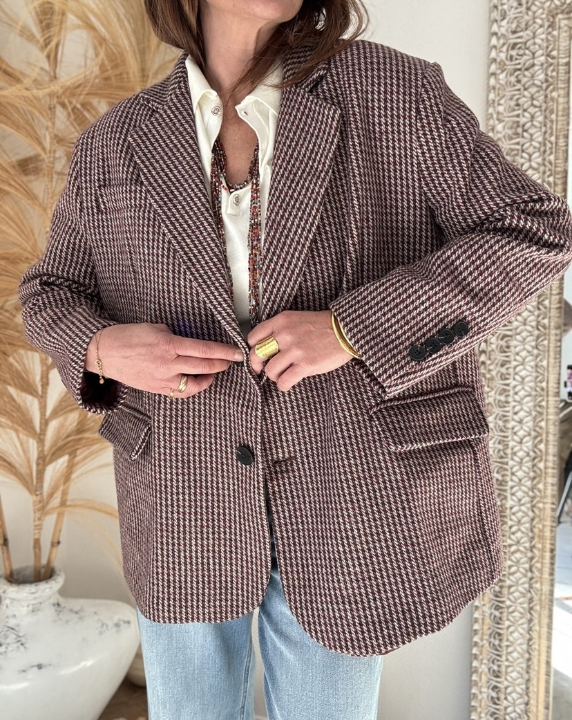 Kali, blazer oversize en pied-de-poule qui apporte immédiatement cette touche chic et affirmée qu’on adore. Ses tons bordeaux et gris, sa très belle qualité italienne et sa doublure bordeaux élégante en font une pièce forte, moderne et facile à assortir. Avec ses boutons en bas des manches et son tombé impeccable, c’est le blazer qui structure la silhouette tout en gardant une allure décontractée et tendance.