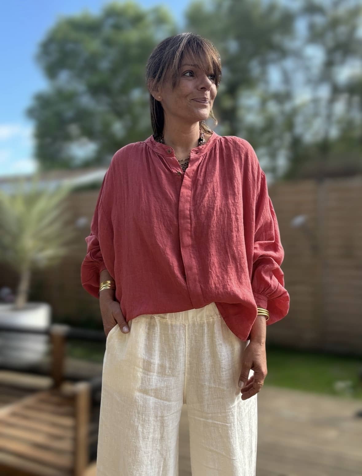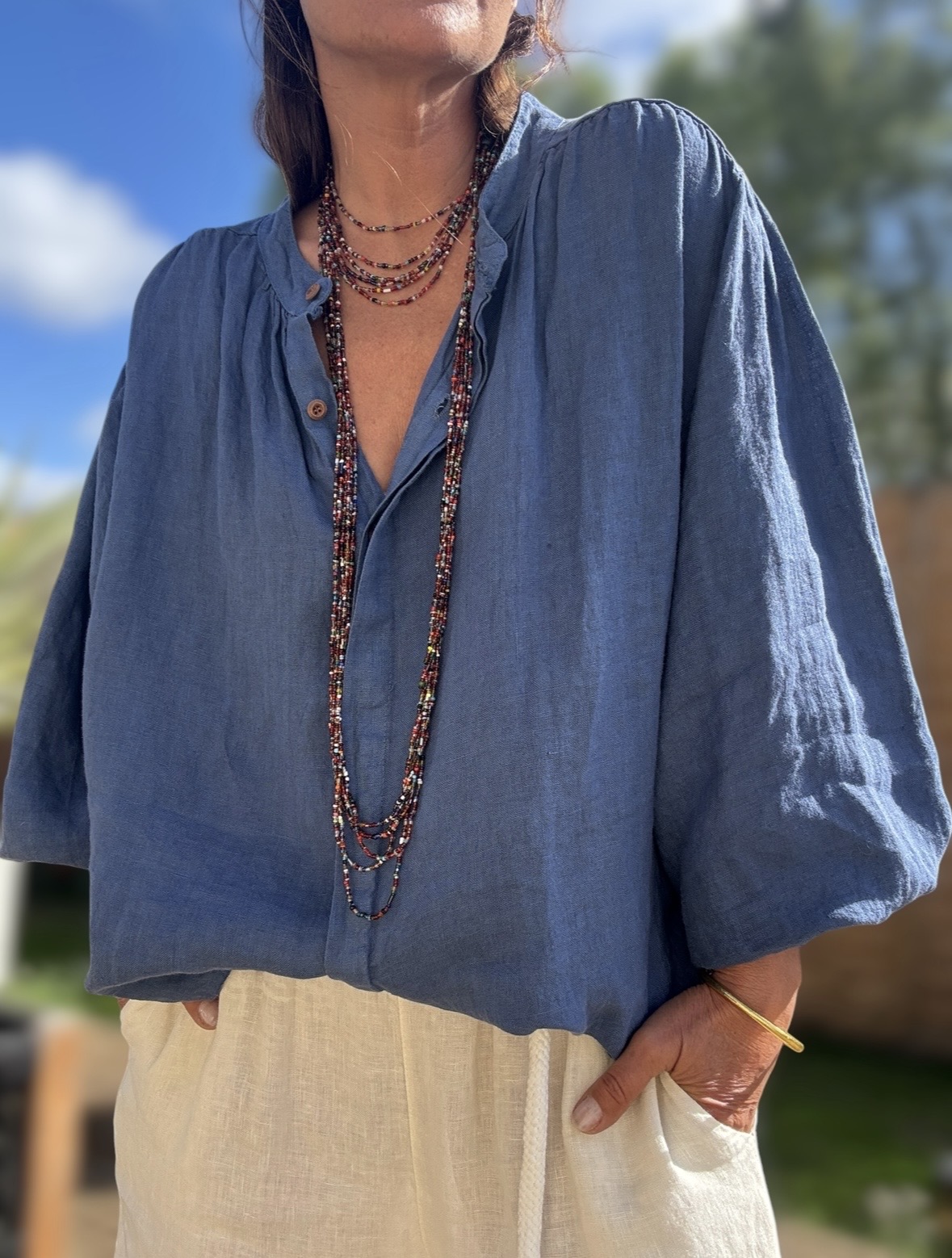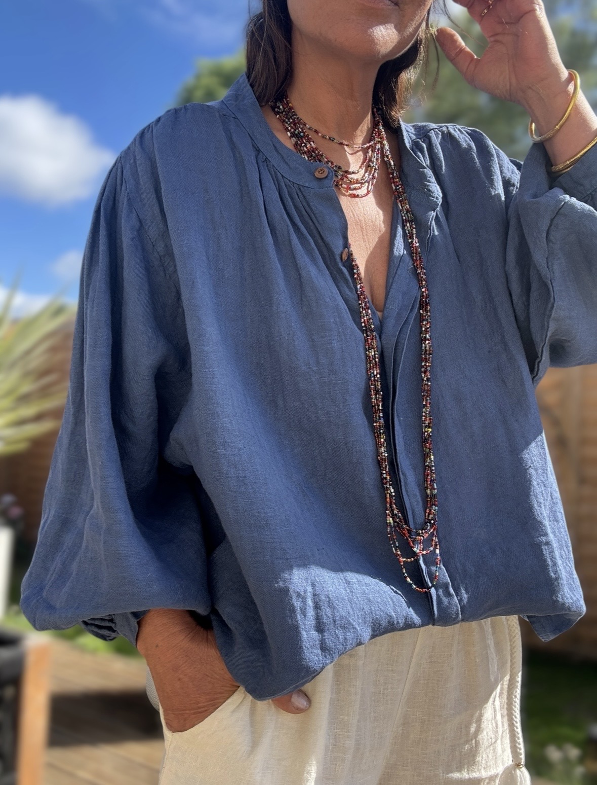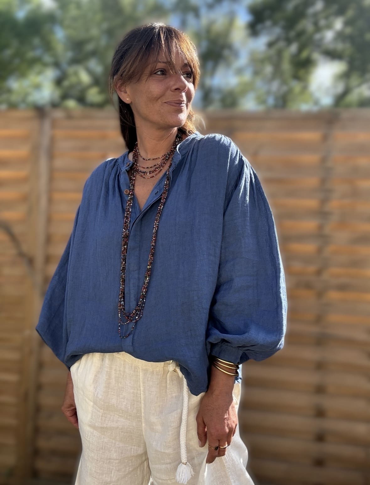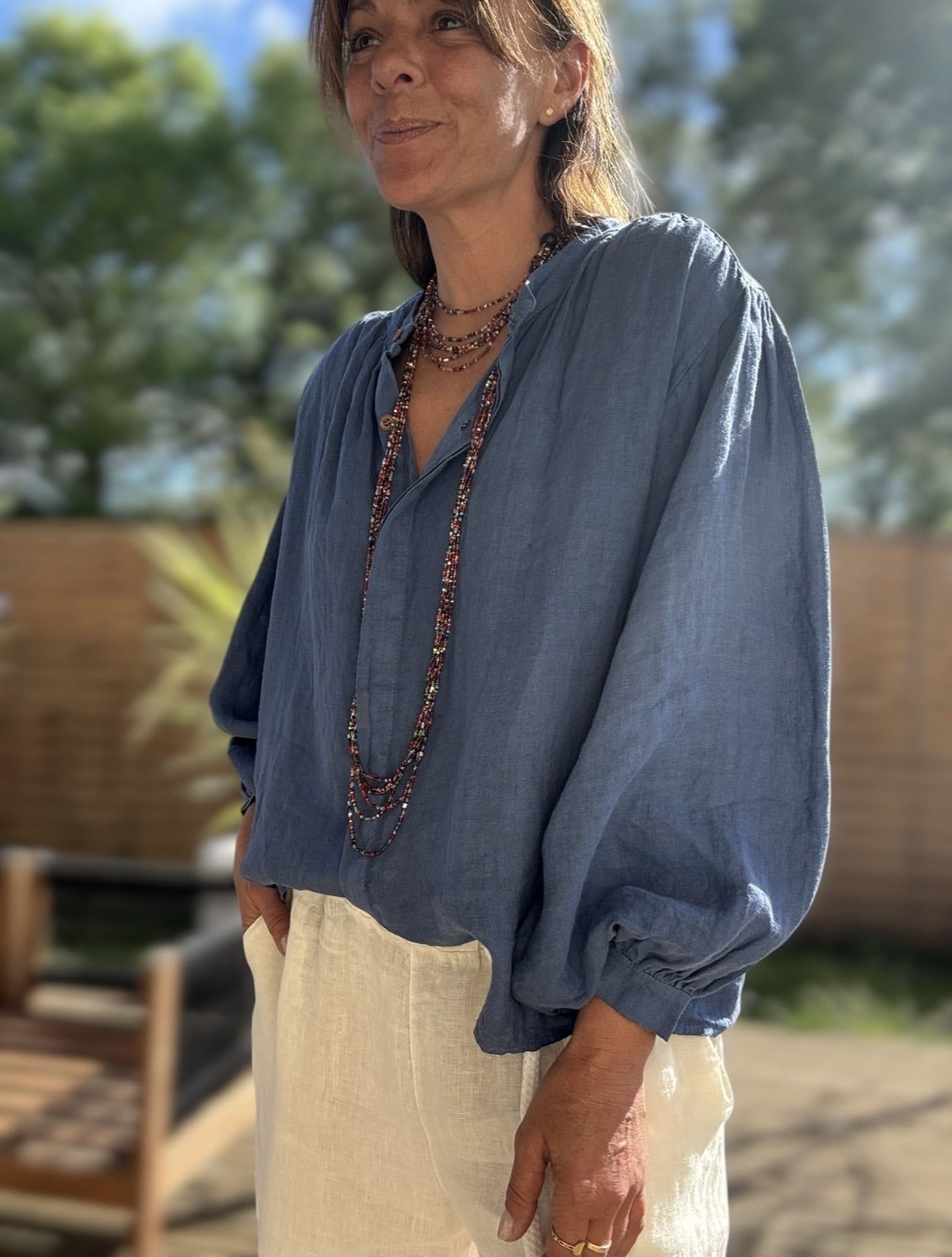 Chemise en lin marine à coupe ample, manches longues, avec boutons raffinés et fronces aux épaules. Fabrication italienne, disponible en plusieurs coloris.