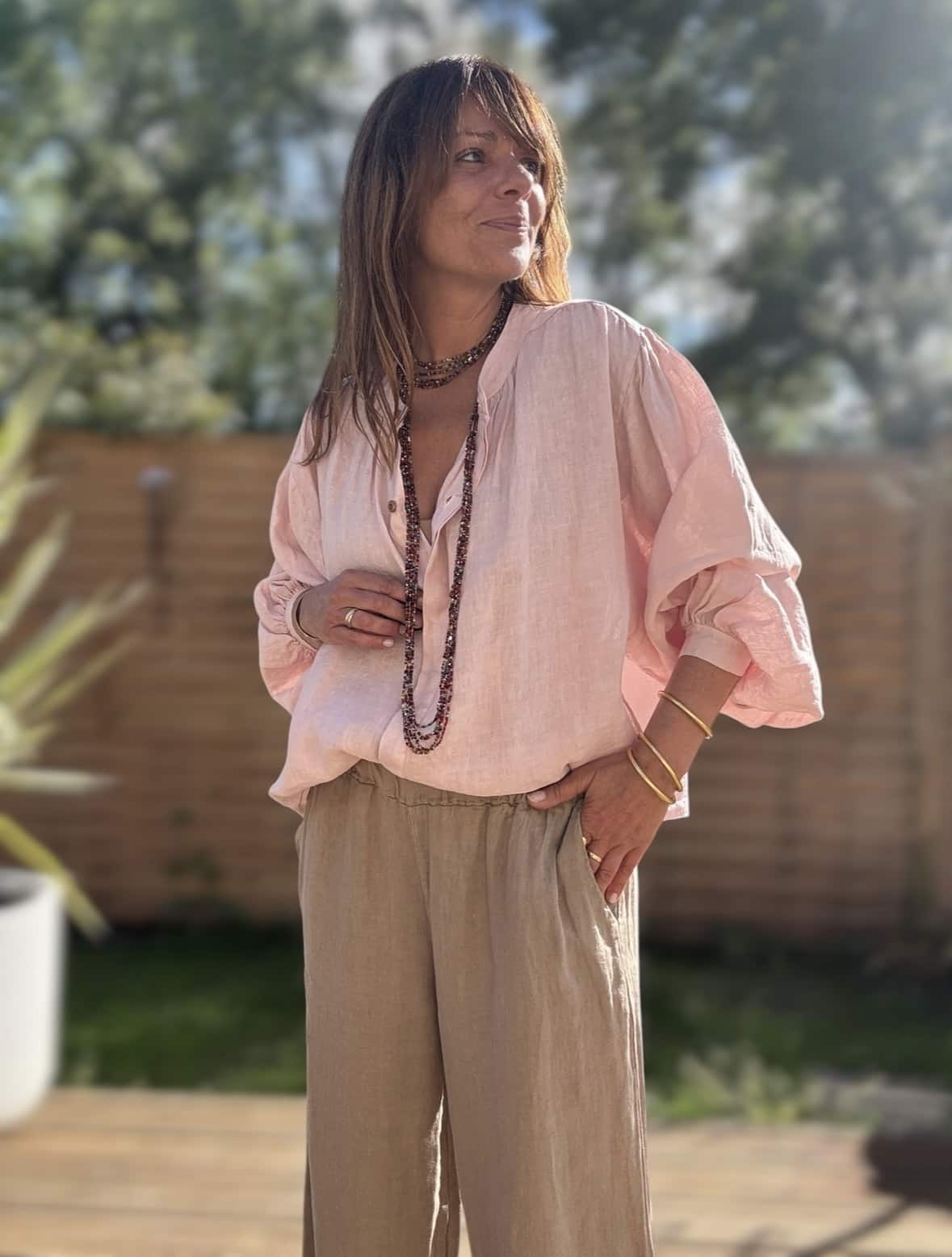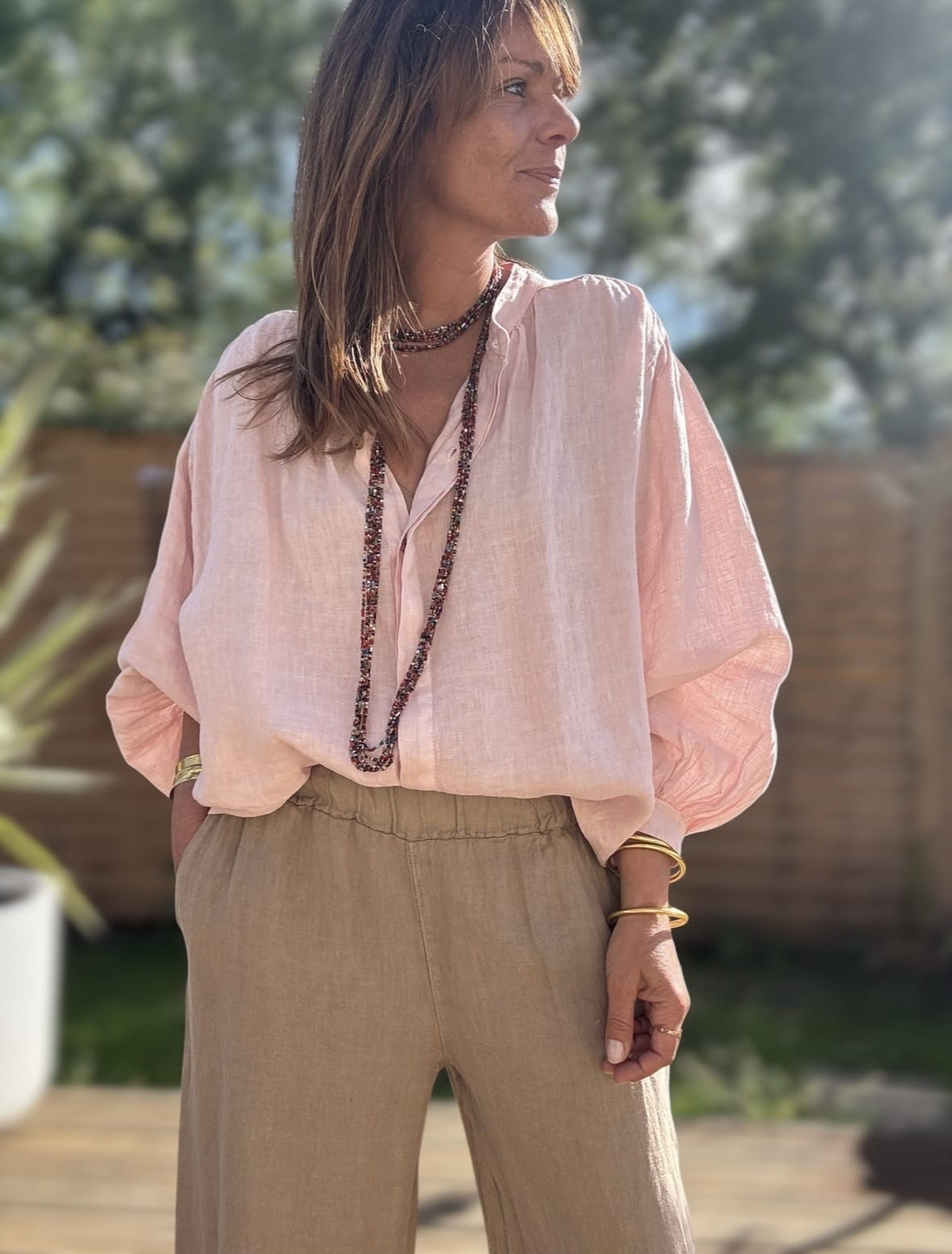 Chemise en lin rose poudré à coupe ample, manches longues, avec boutons raffinés et fronces aux épaules. Fabrication italienne, disponible en plusieurs coloris.
