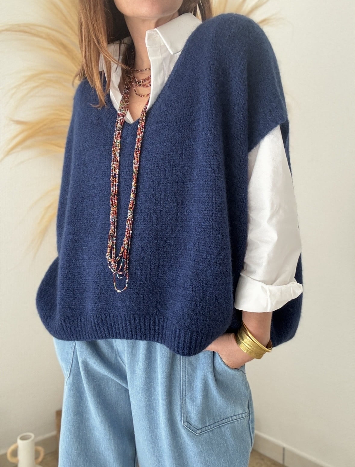 Enfin, la teinte marine traverse les saisons sans se démoder. Elle s’associe facilement à des bas colorés, neutres ou imprimés. Portée avec un pantalon en lin, un jean brut ou une jupe fluide, elle s’adapte à tous les styles.