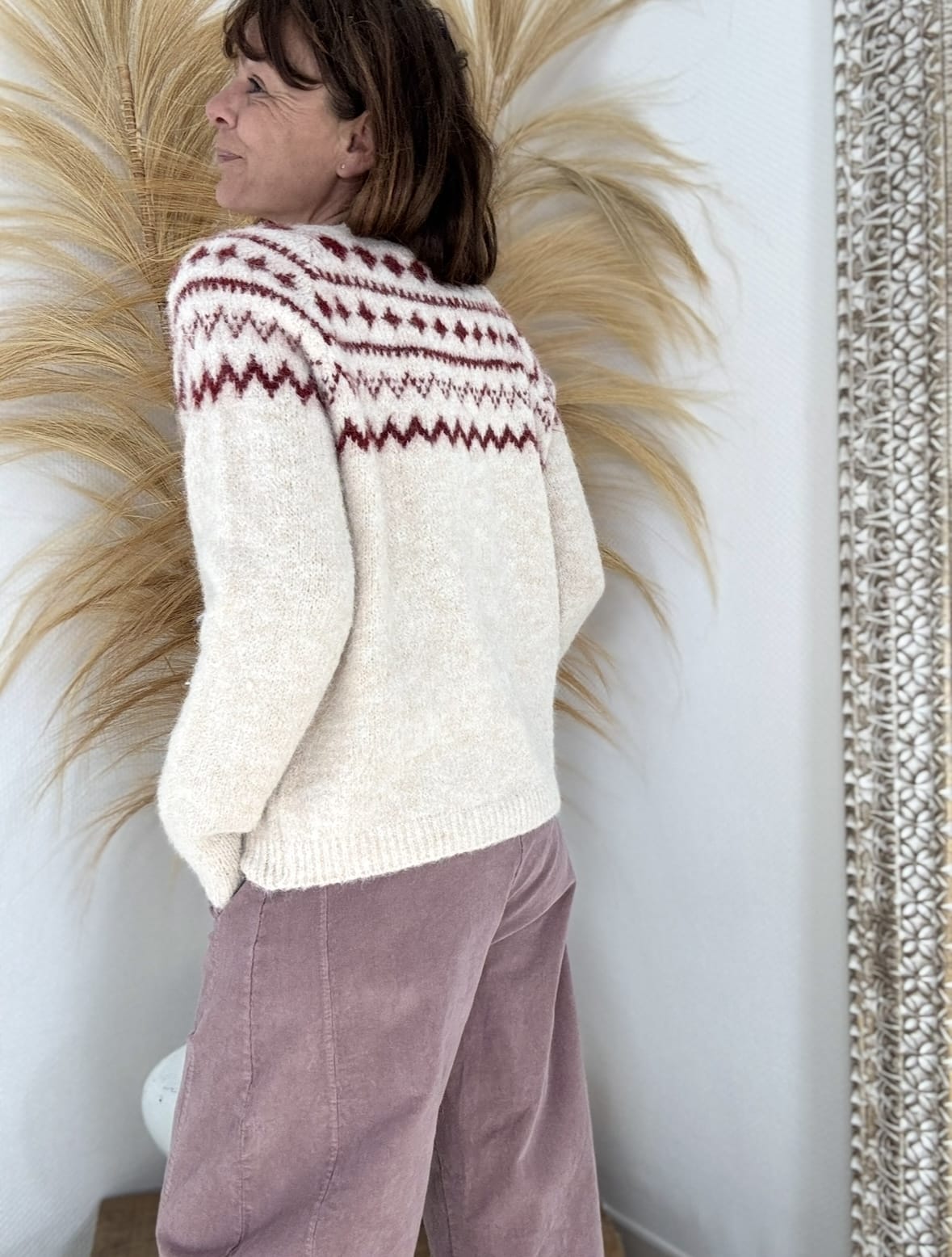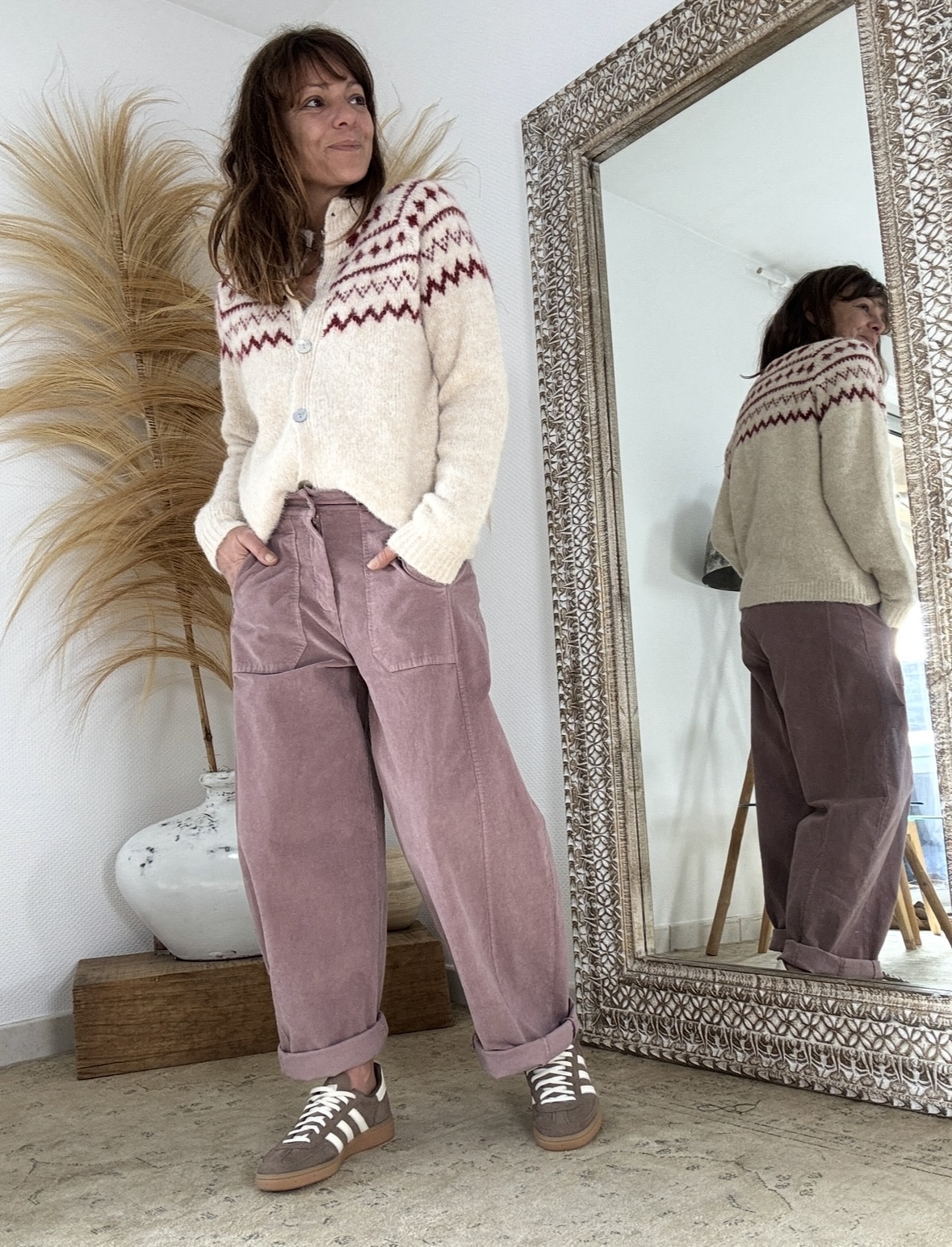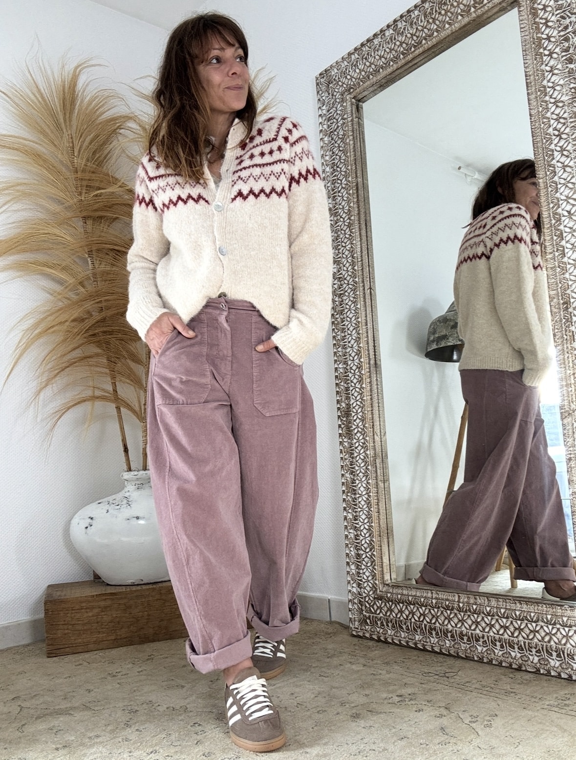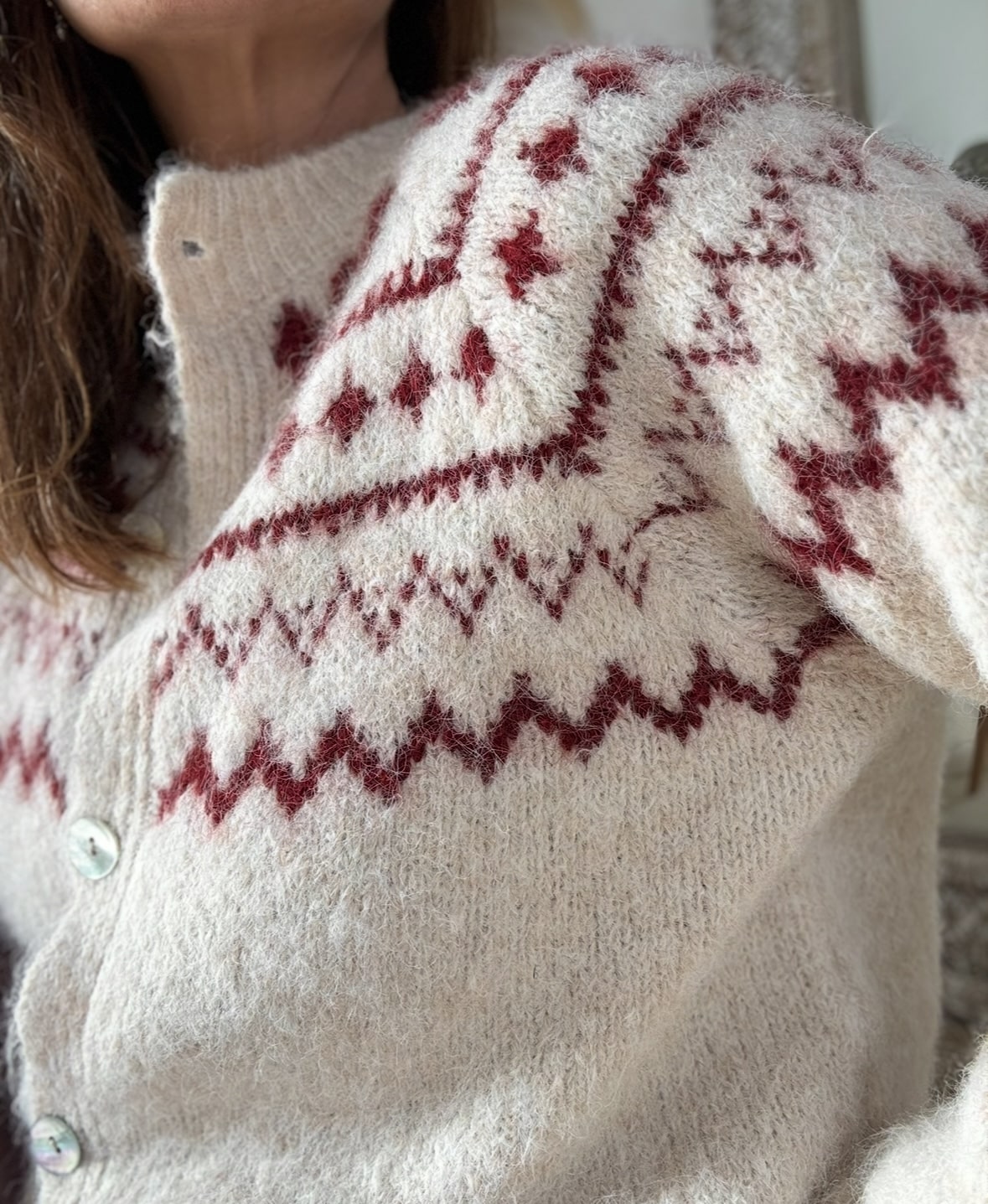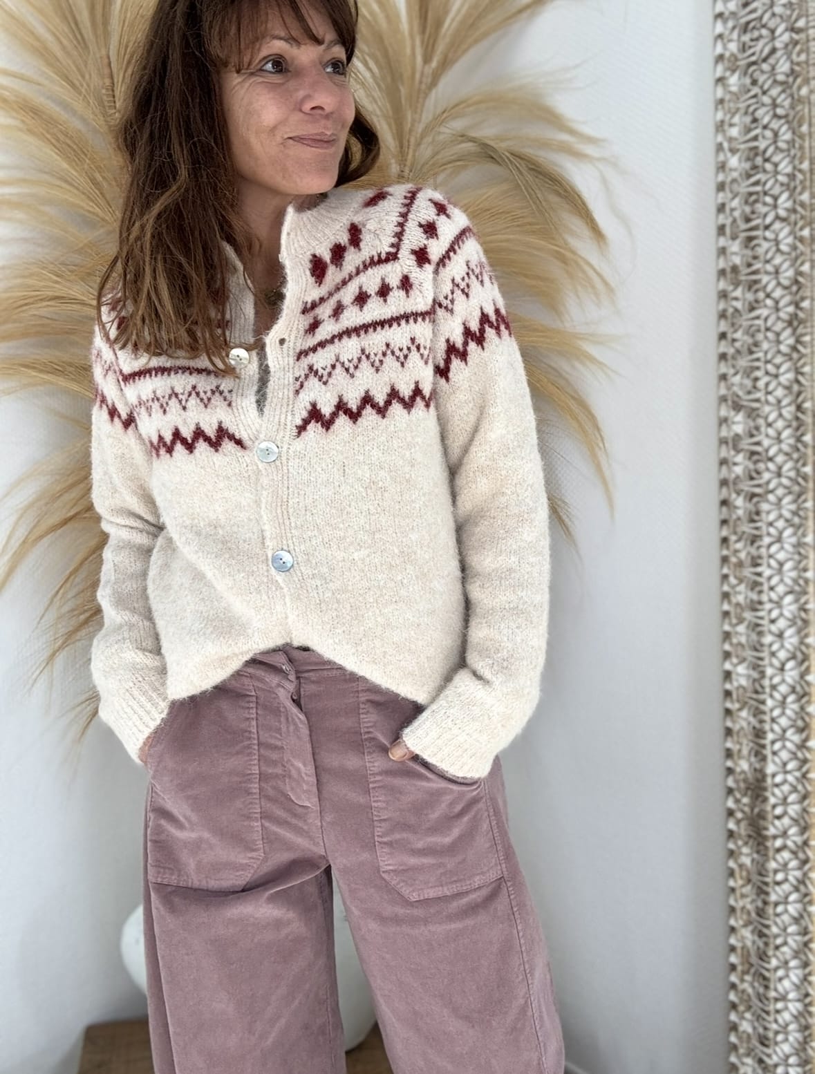 Brigit le gilet doux et chaud, coloris beige à motifs bordeaux, boutons nacrés, coupe droite, fabrication italienne. Taille unique (36–40). Laurence mesure 1m64 et porte du 38. Existe aussi en chocolat et en anthracite .