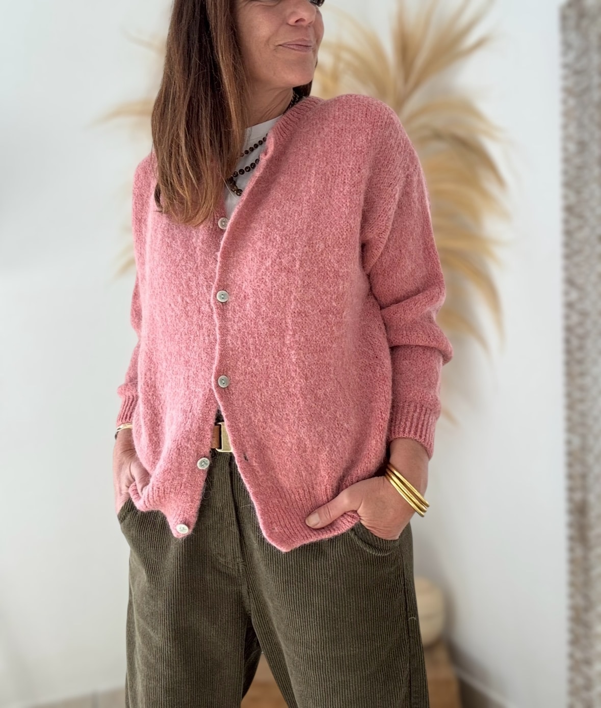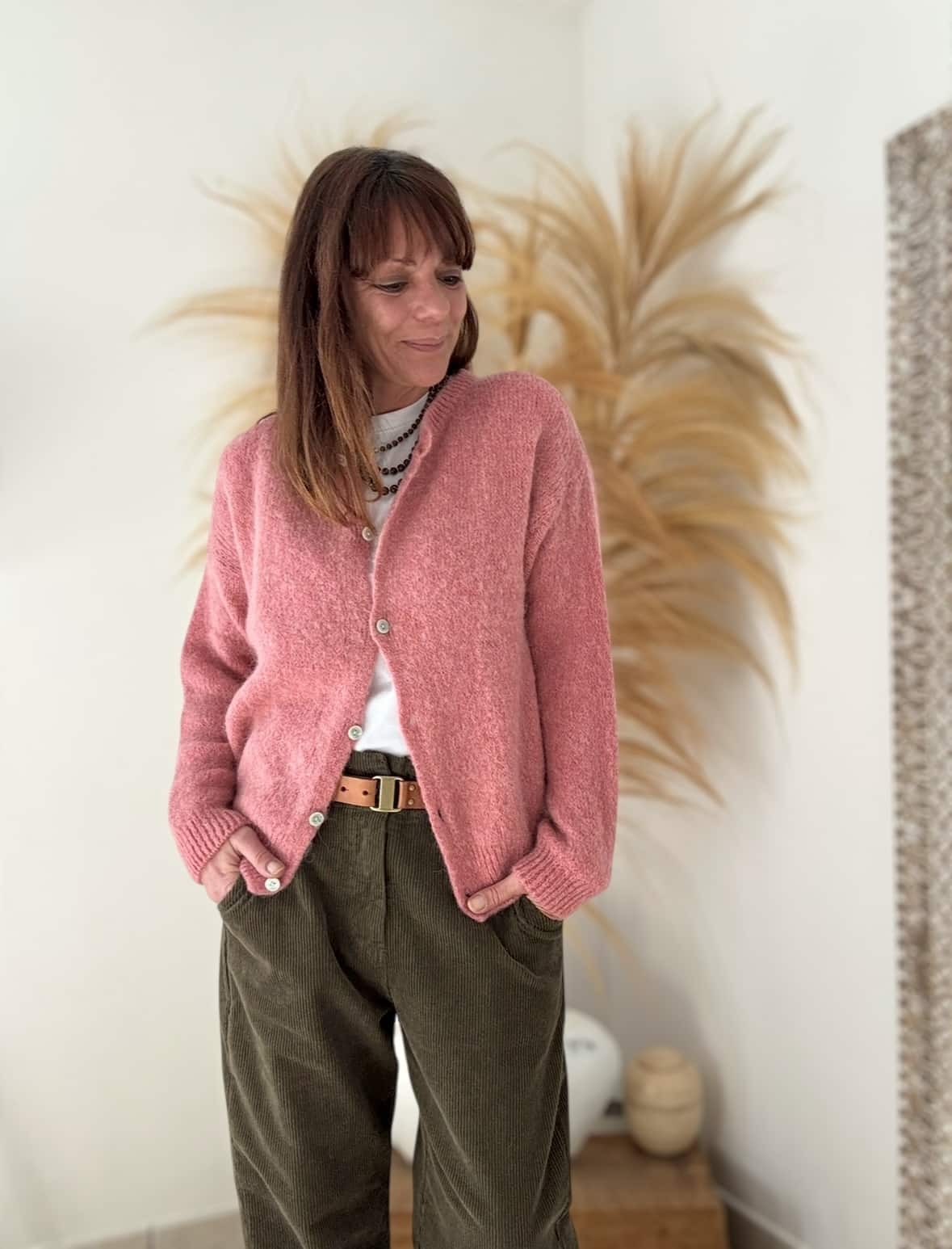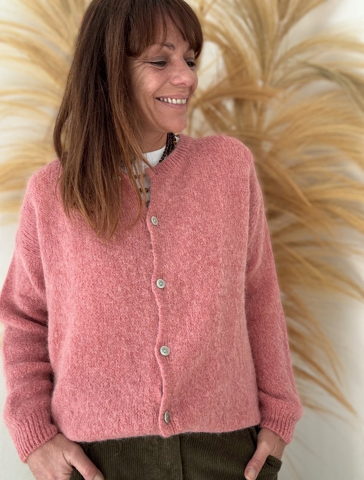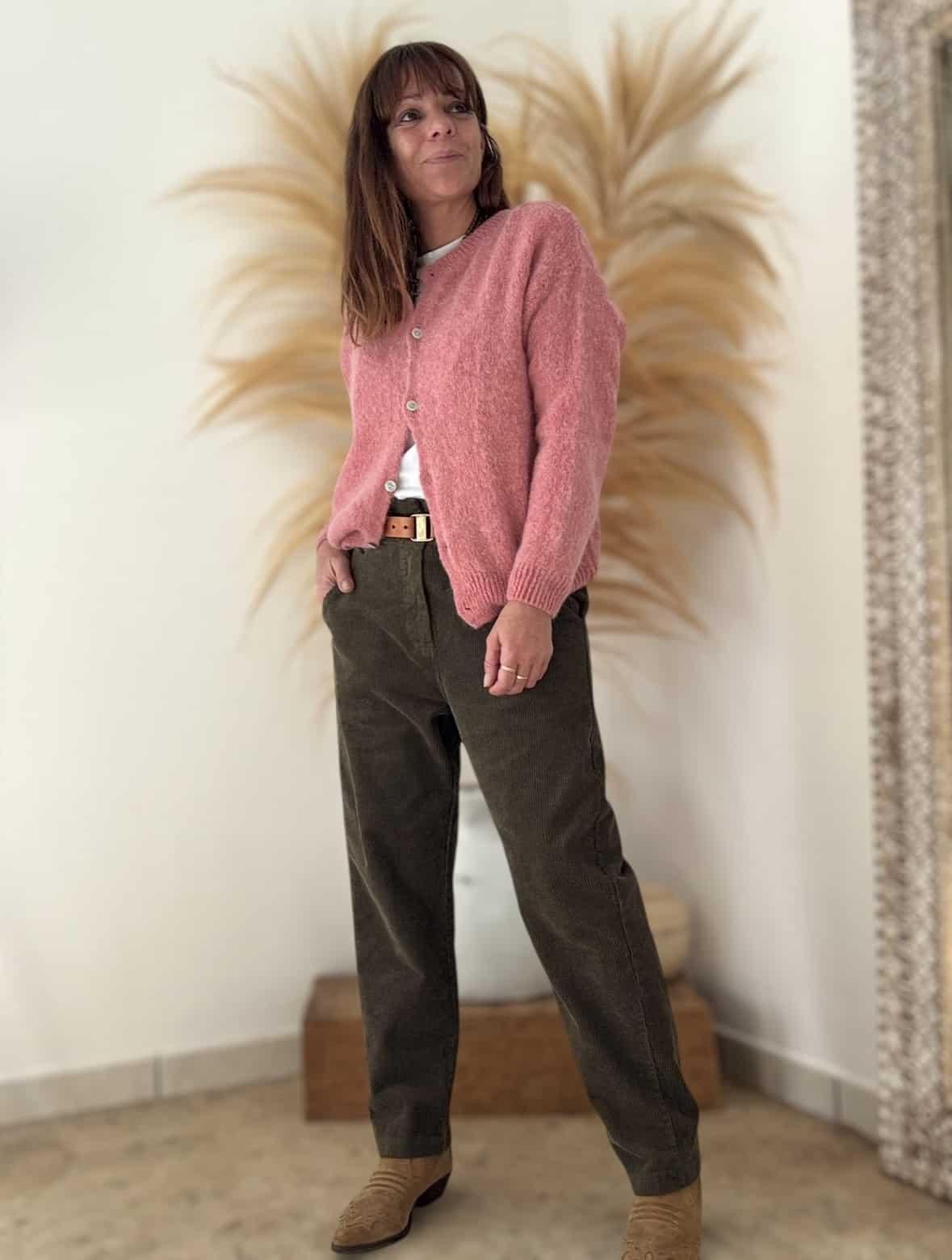 Le gilet BURMA est un vrai cocon de douceur. Vieux rose. Sa maille moelleuse contient 52 % de baby alpaga, idéale pour l’automne ou les soirées fraîches. Il est de fabrication italienne, coupe droite, col rond. Taille unique, il convient du 36 au 40. Disponible également en noir et en marine.