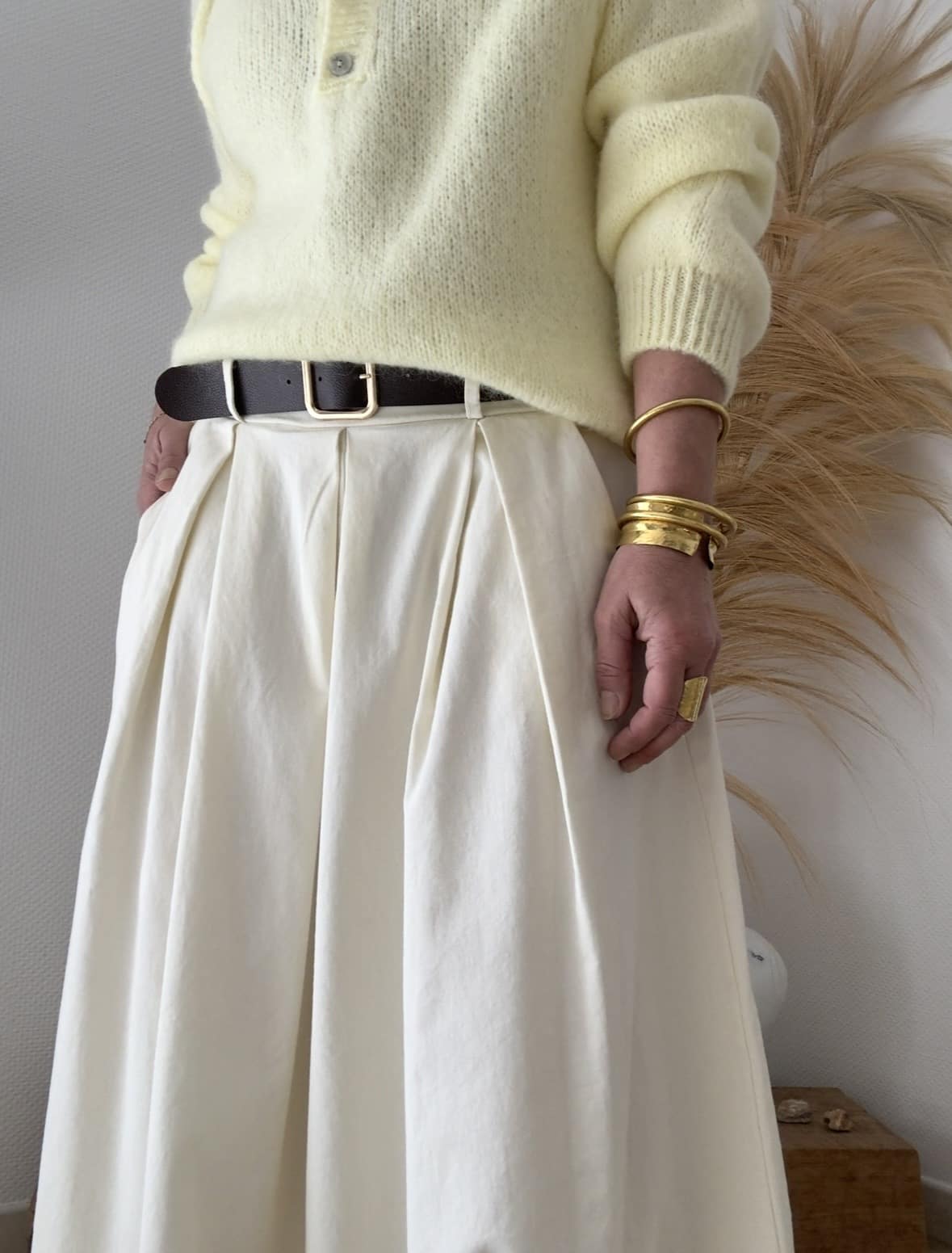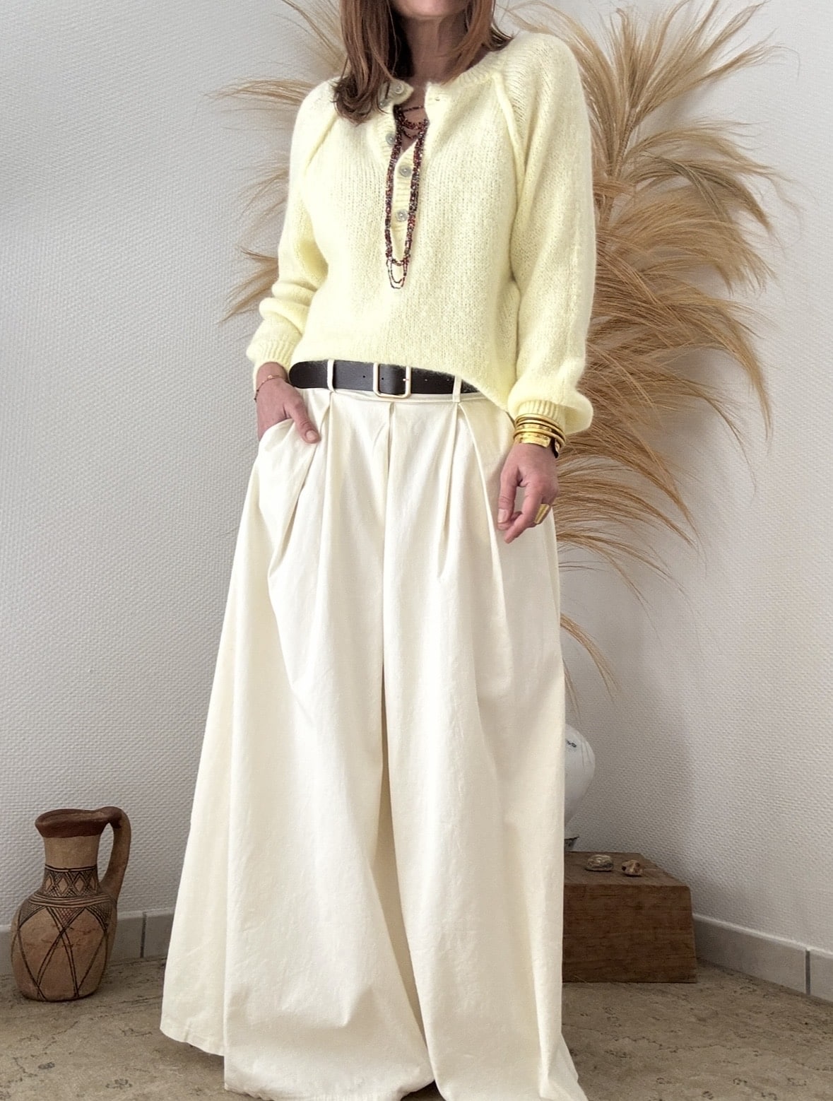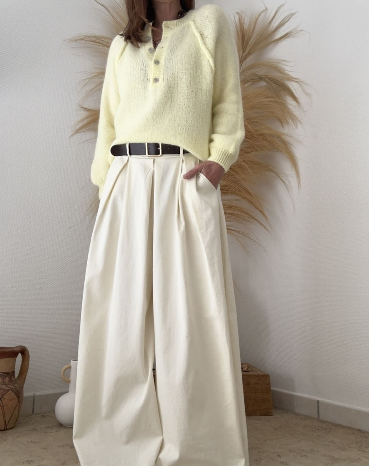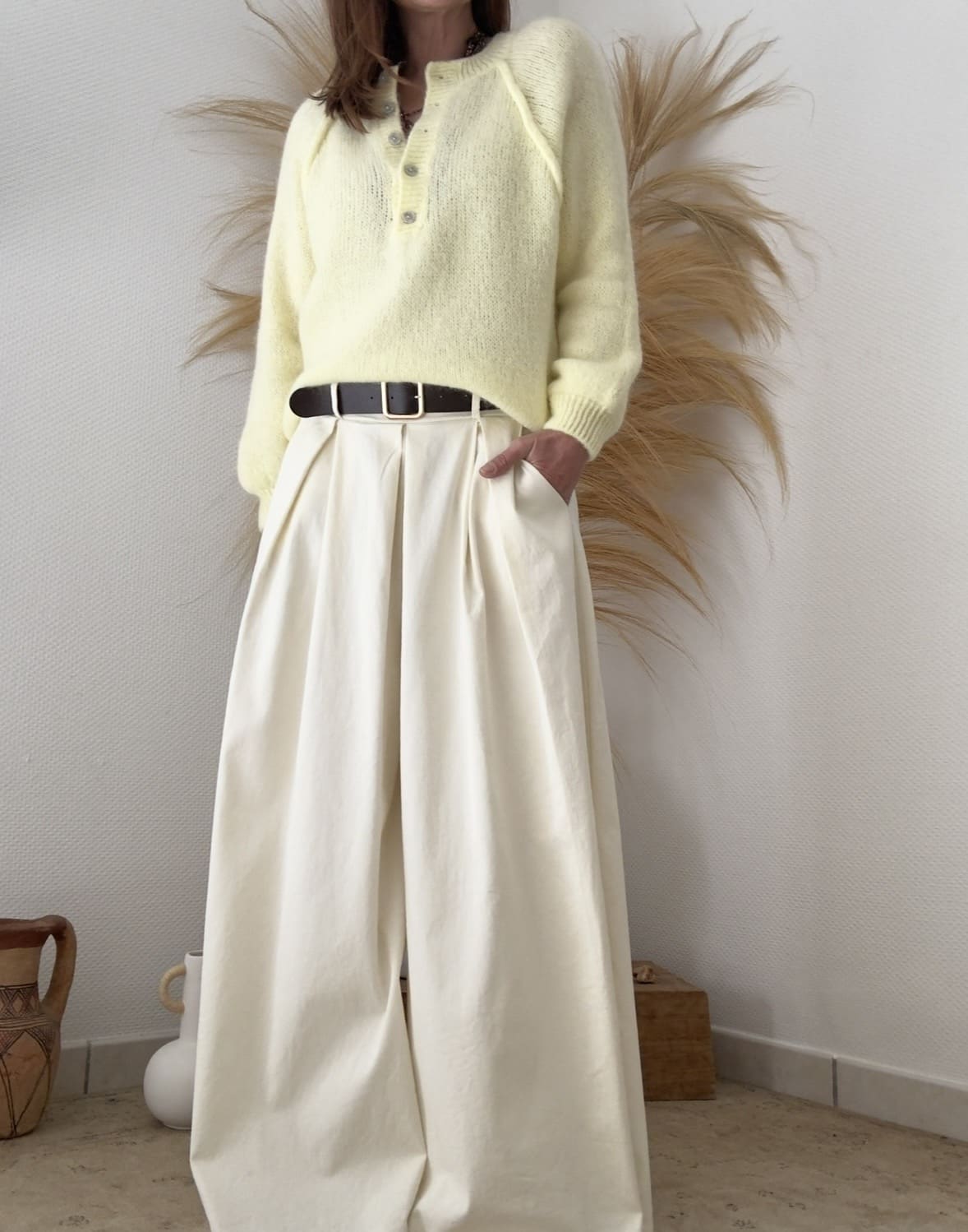 Facile à associer avec un simple t-shirt, une blouse fluide ou une maille légère, Alice est une pièce intemporelle, lumineuse et raffinée, idéale pour la saison.