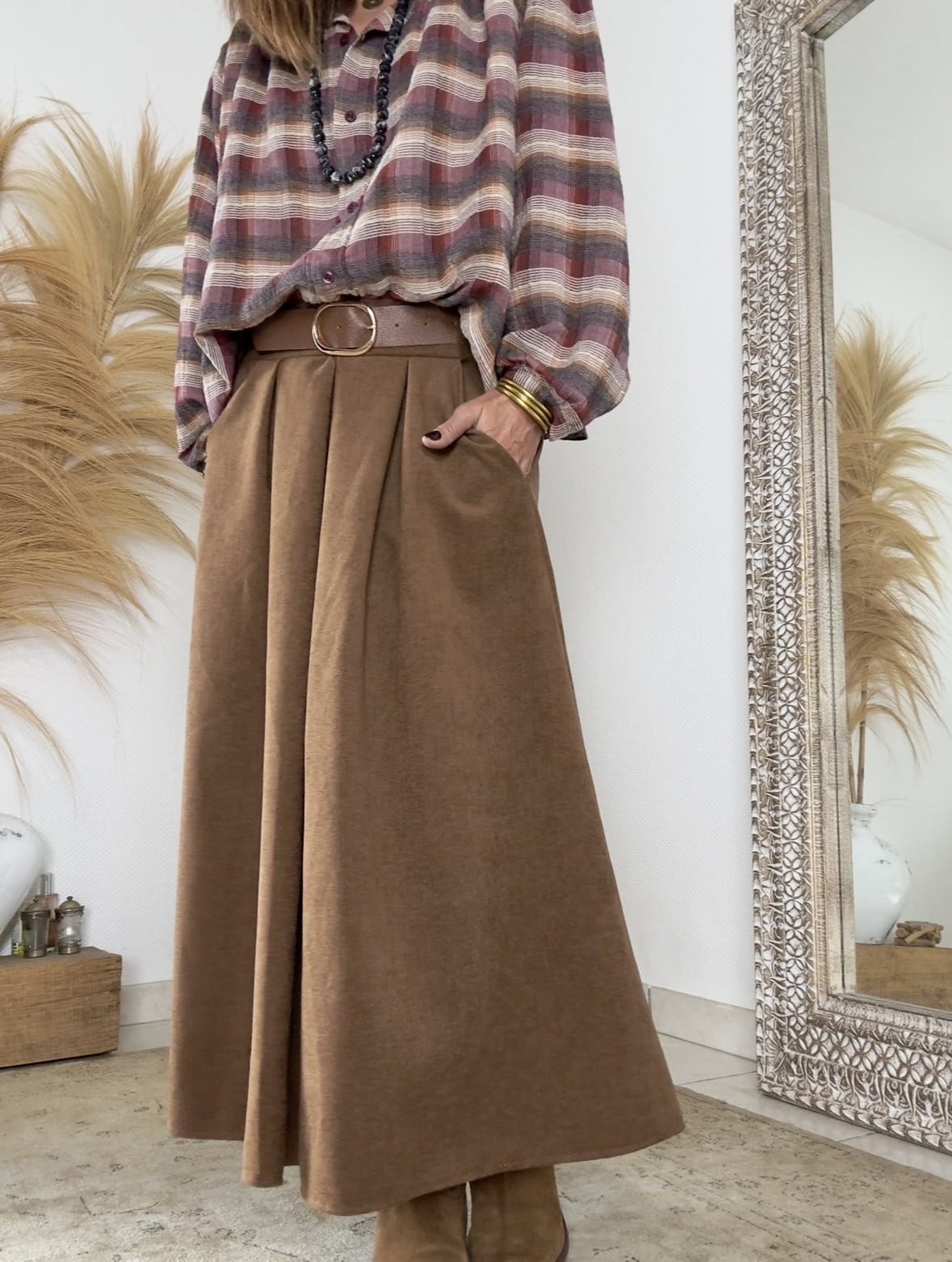 De couleur camel, la jupe FLORA évoque la chaleur des teintes naturelles.