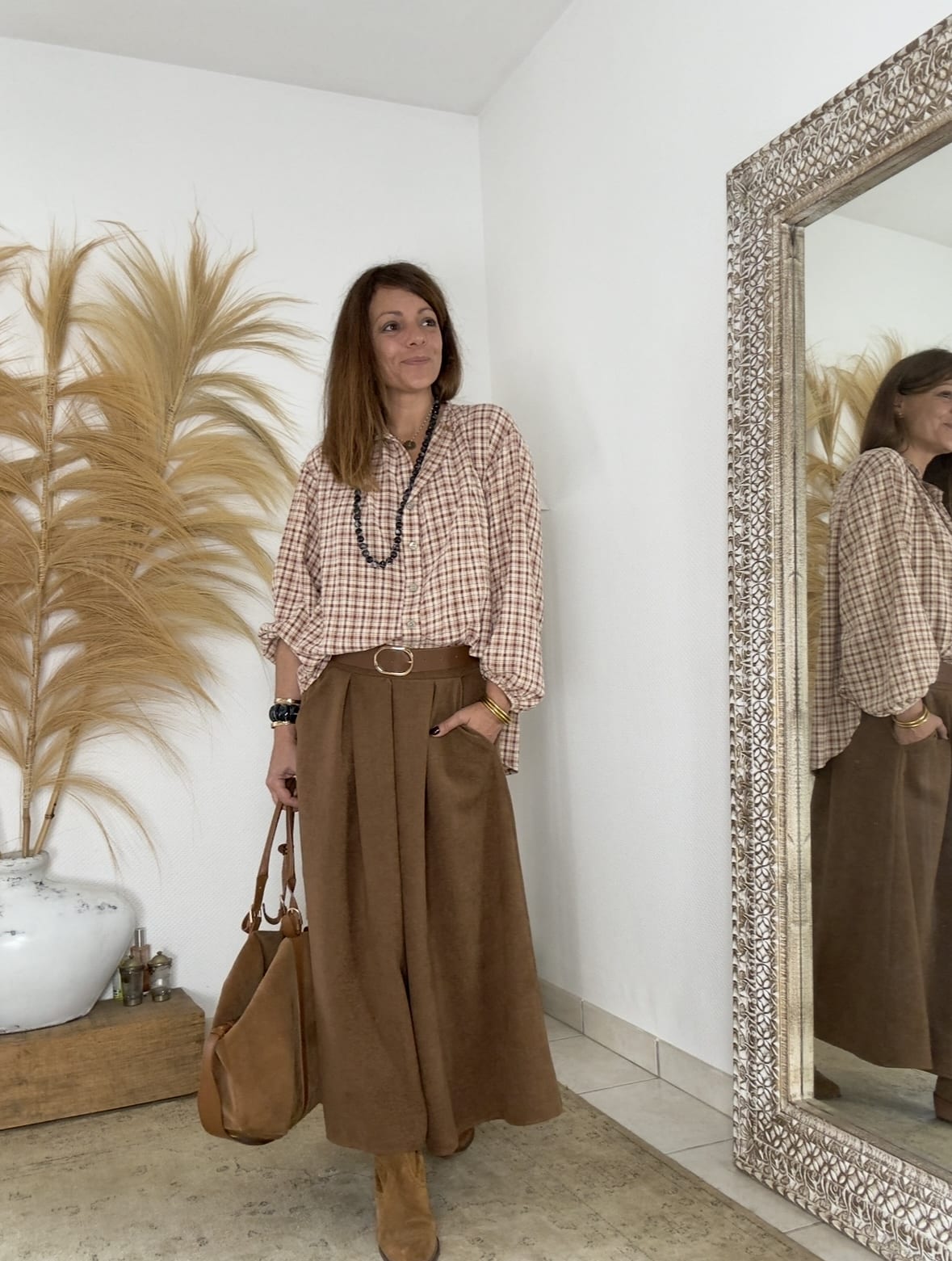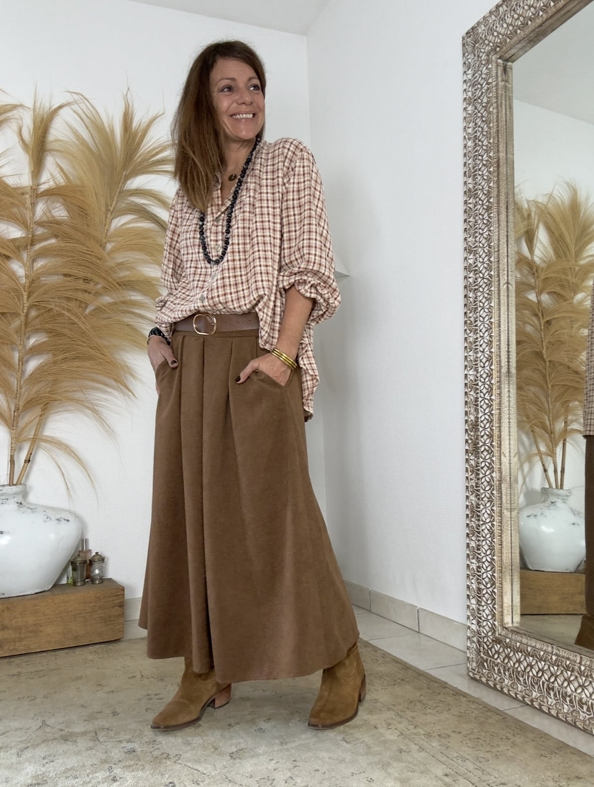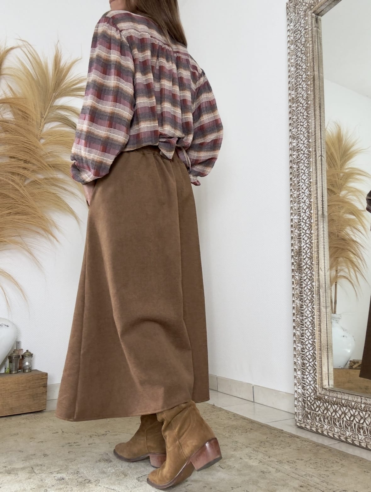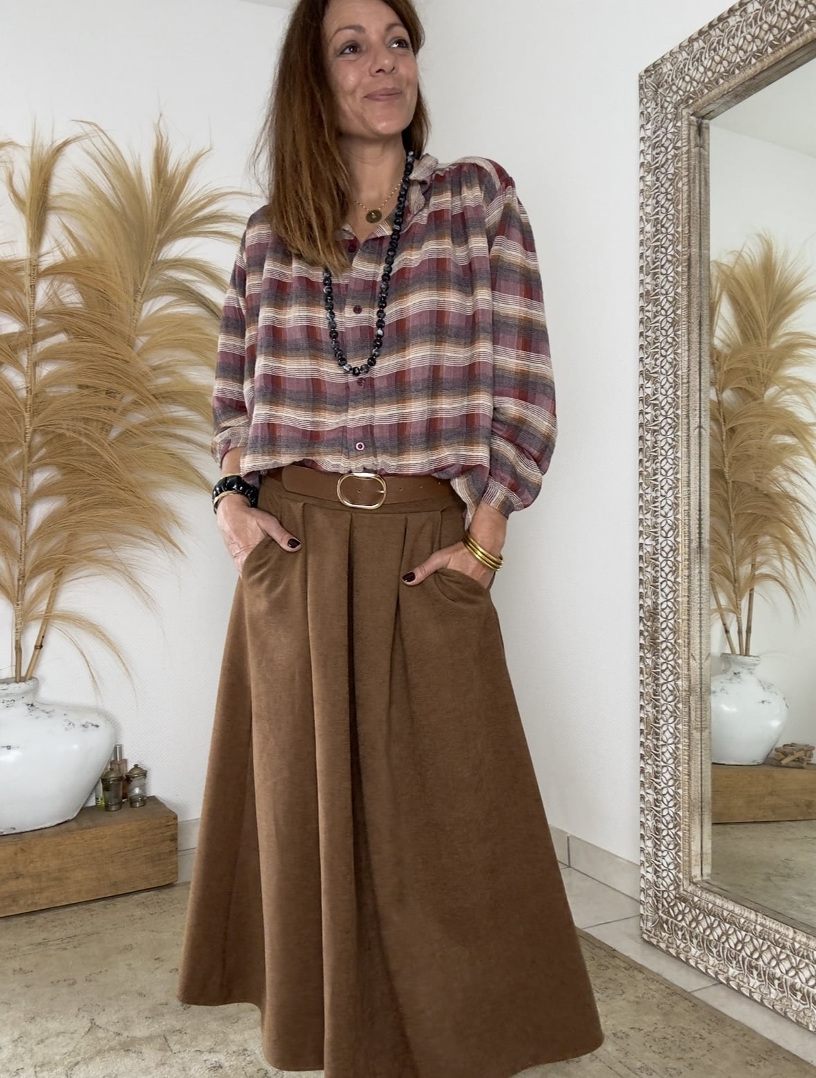Cette jupe se porte facilement en toute saison, avec un pull moelleux, une chemise fluide ou une veste légère.