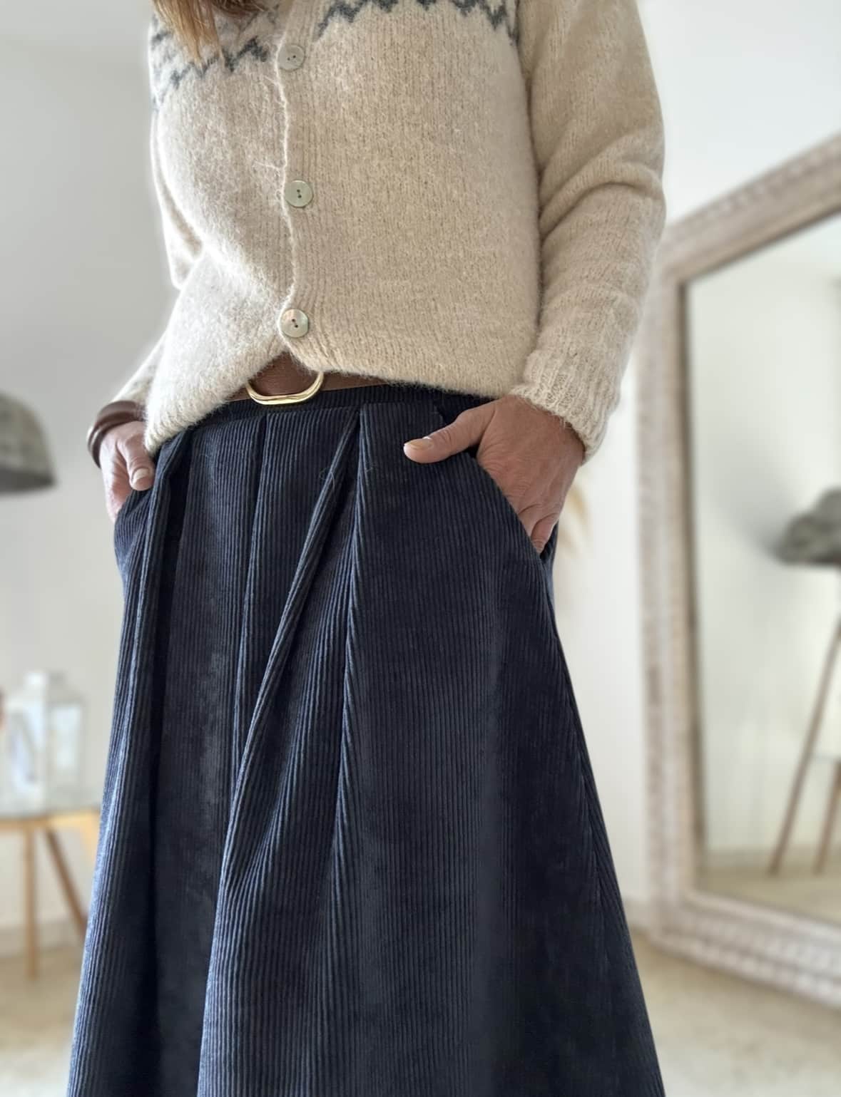 Jupe Damara en velours bleu, fluide et longue, avec pinces, poches côtés, dos élastique et ceinture incluse. Très jolie couleur bleue et tombé élégant. Taille unique (38–42). Laurence mesure 1,64 m et porte un 38. Fabrication italienne.