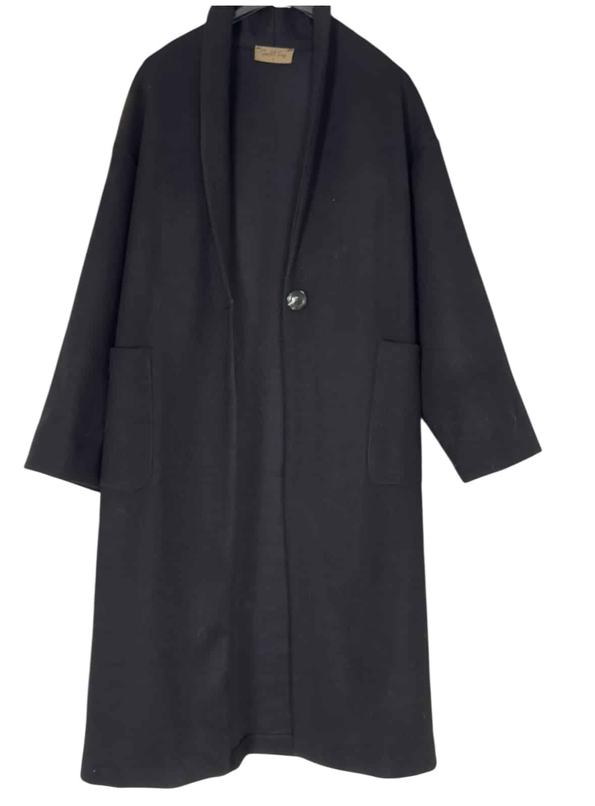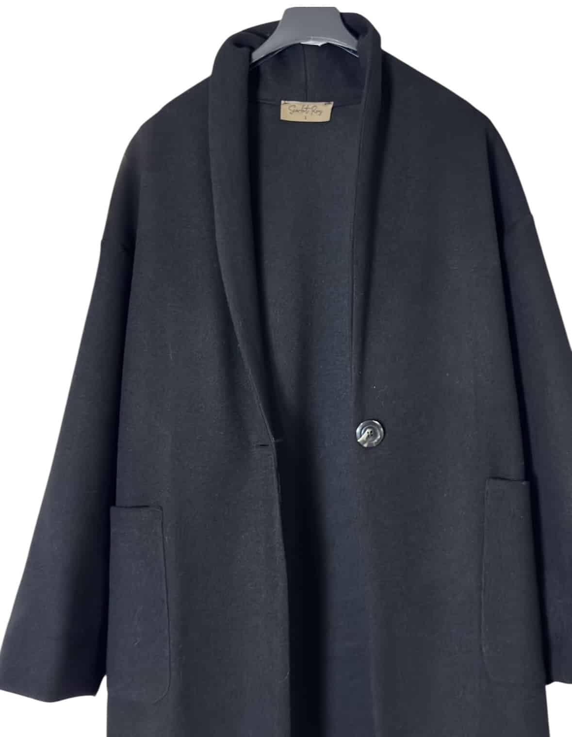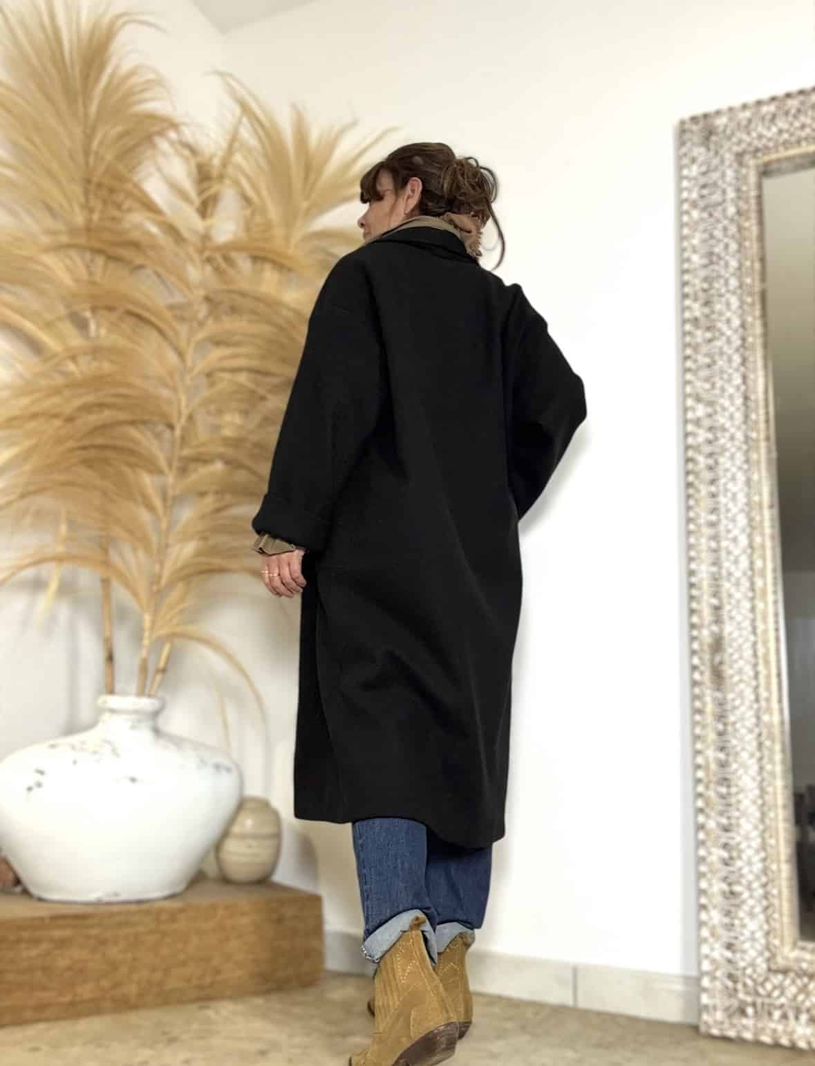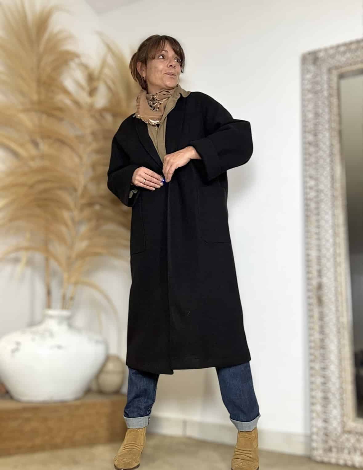 Manteau Noah noir, coupe oversize et fabrication 100% française, parfait pour glisser un gros pull en dessous tout en restant chic. Fermeture par bouton, poches côtés. Taille 1 (convient pour un 36–40). Laurence mesure 1,64 m et porte habituellement un 38.
