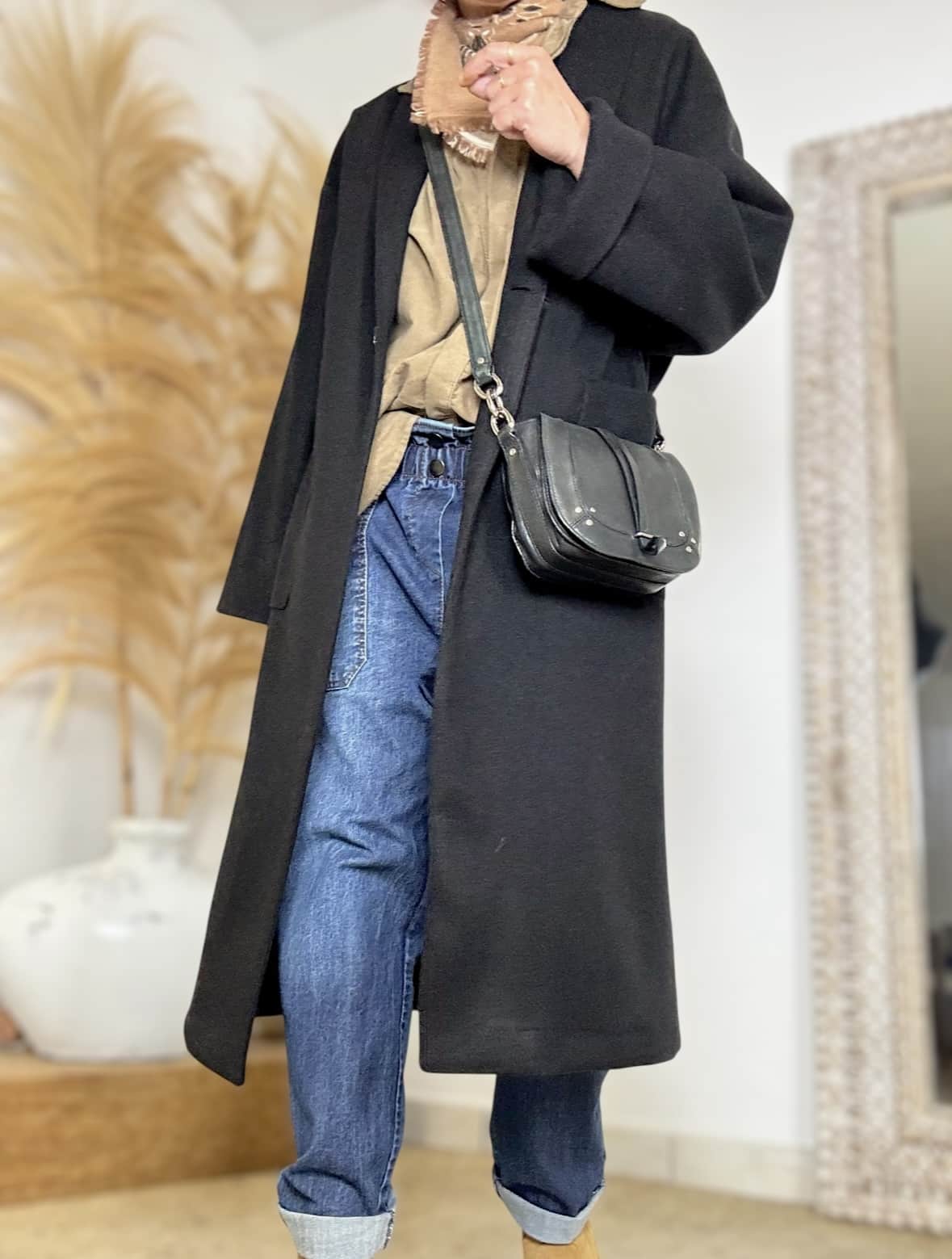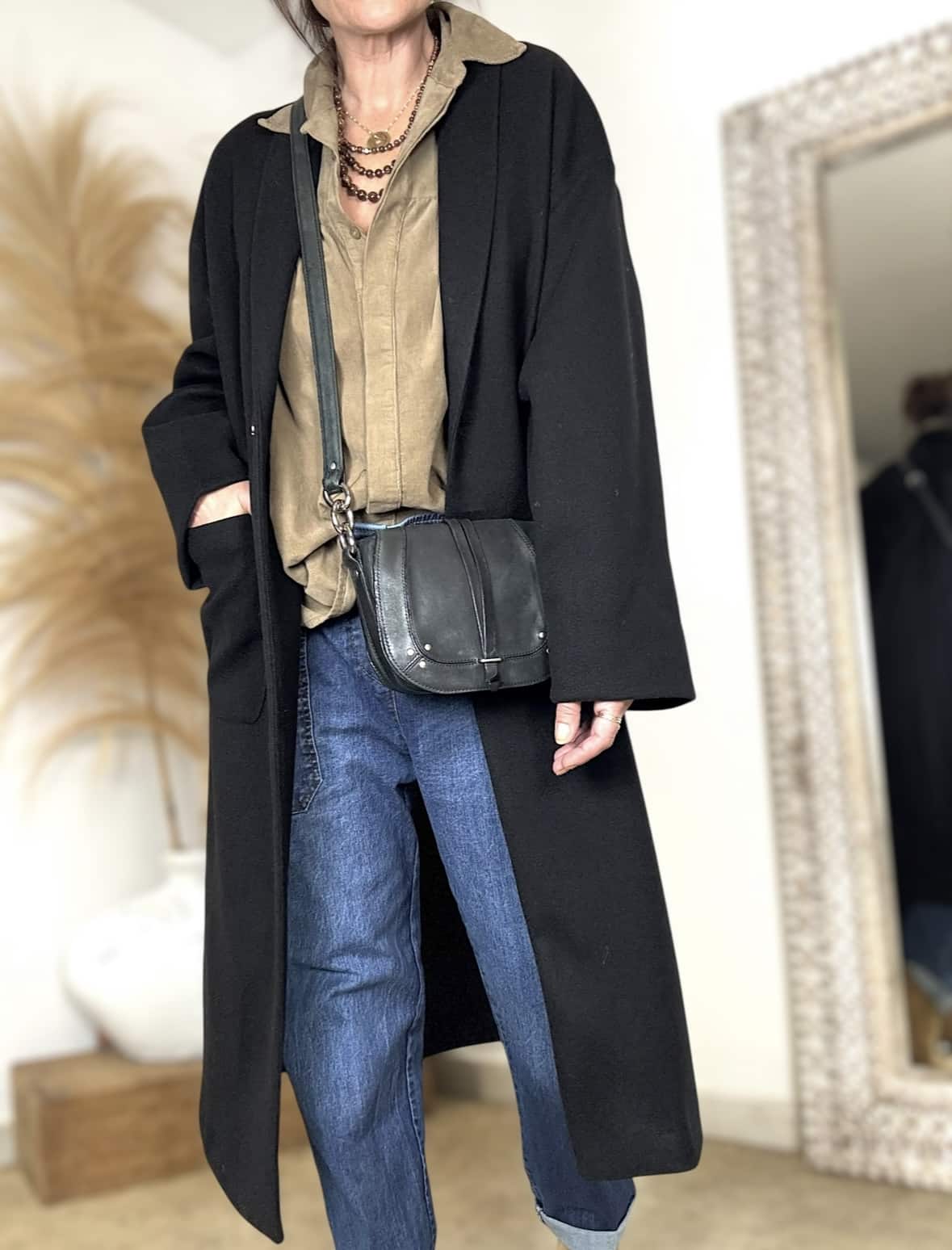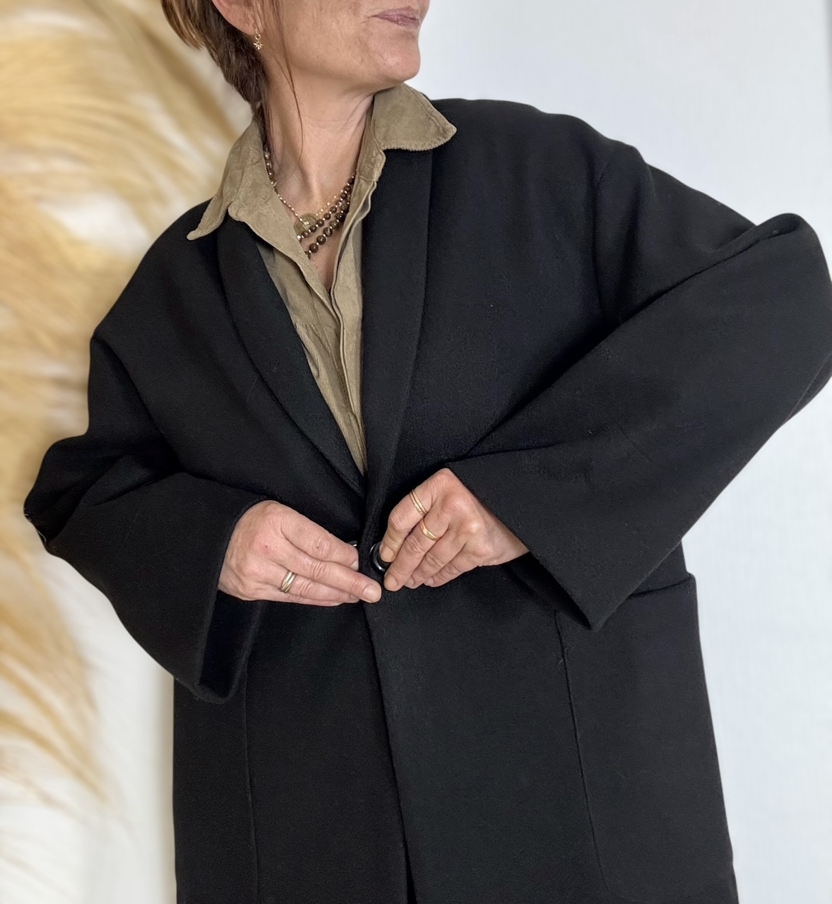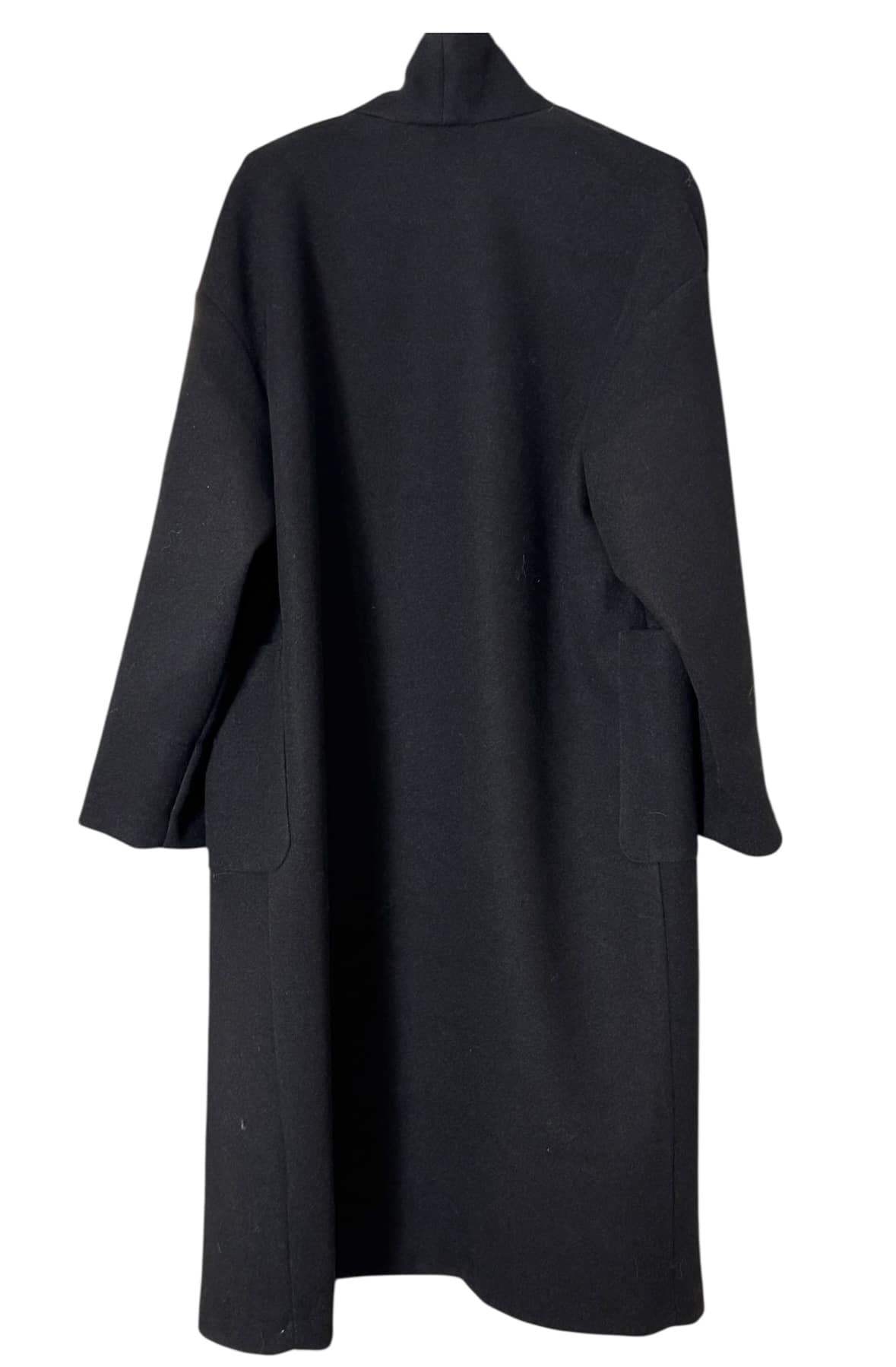 Manteau Noah noir, coupe oversize et fabrication 100% française, parfait pour glisser un gros pull en dessous tout en restant chic. Fermeture par bouton, poches côtés. Taille 1 (convient pour un 36–40). Laurence mesure 1,64 m et porte habituellement un 38.