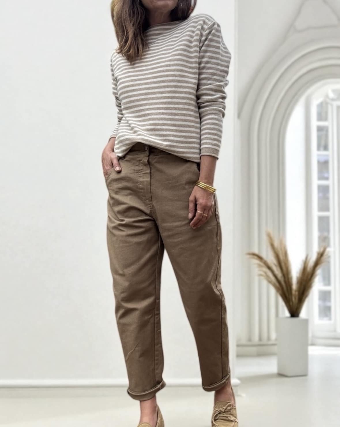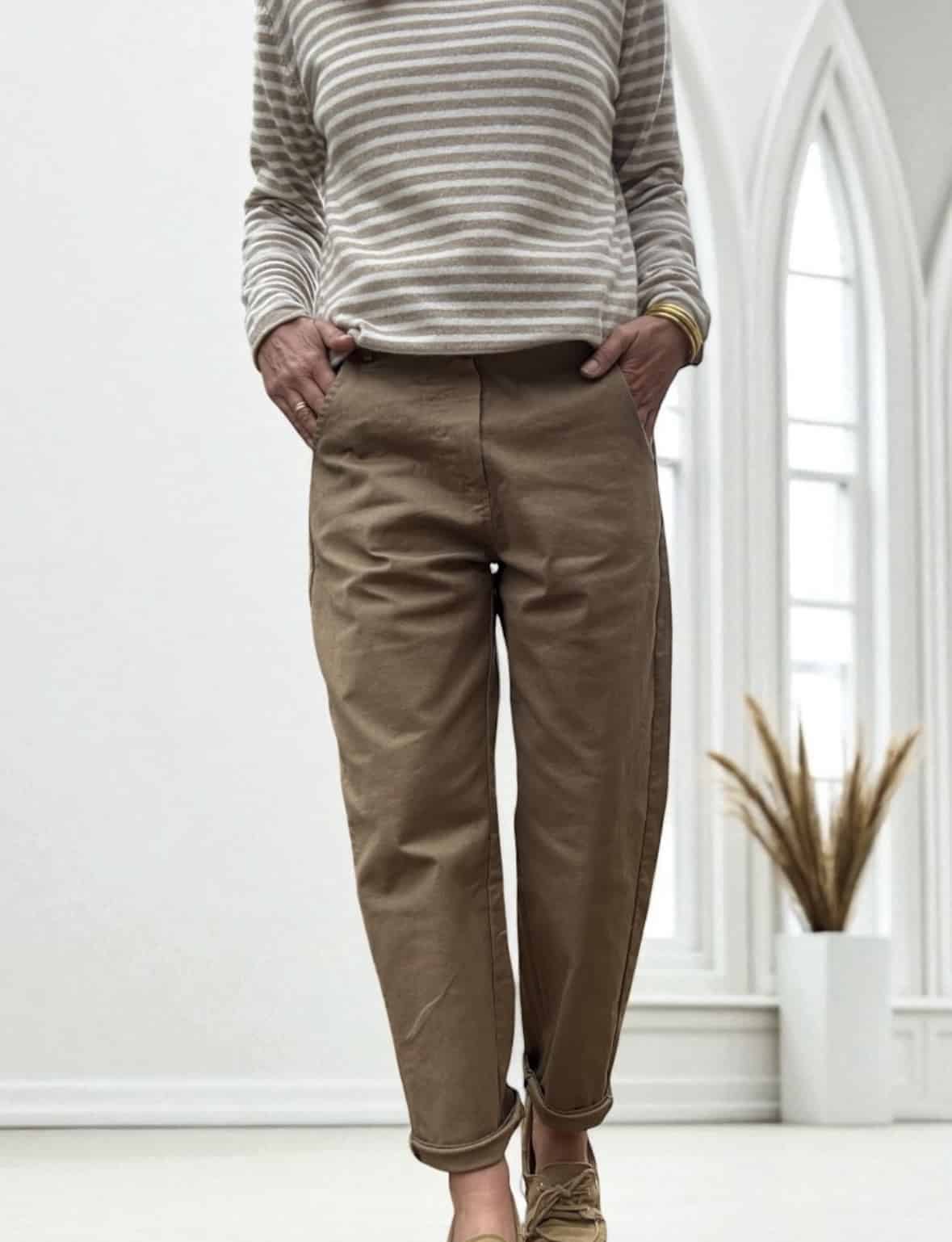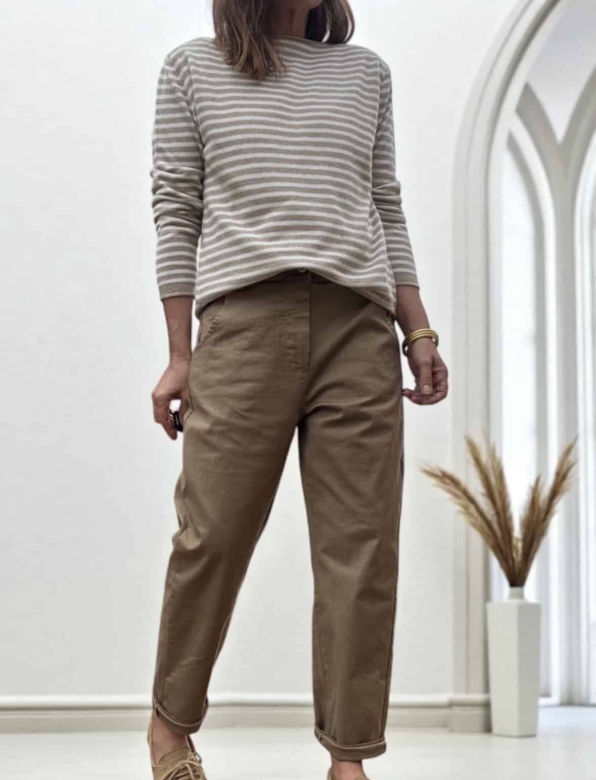 Associez votre pantalon en coton camel au pull Intuition rayé écru et camel pour un style décontracté chic.