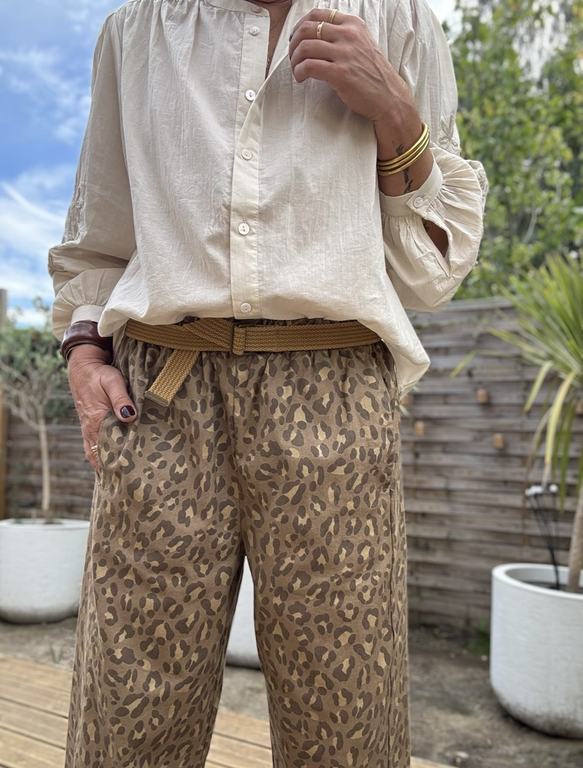 Le pantalon léopard camel en coton INTUITION allie confort, tendance et praticité. Il deviendra vite une pièce incontournable de votre dressing. Osez l’imprimé et créez facilement des looks audacieux et chics.