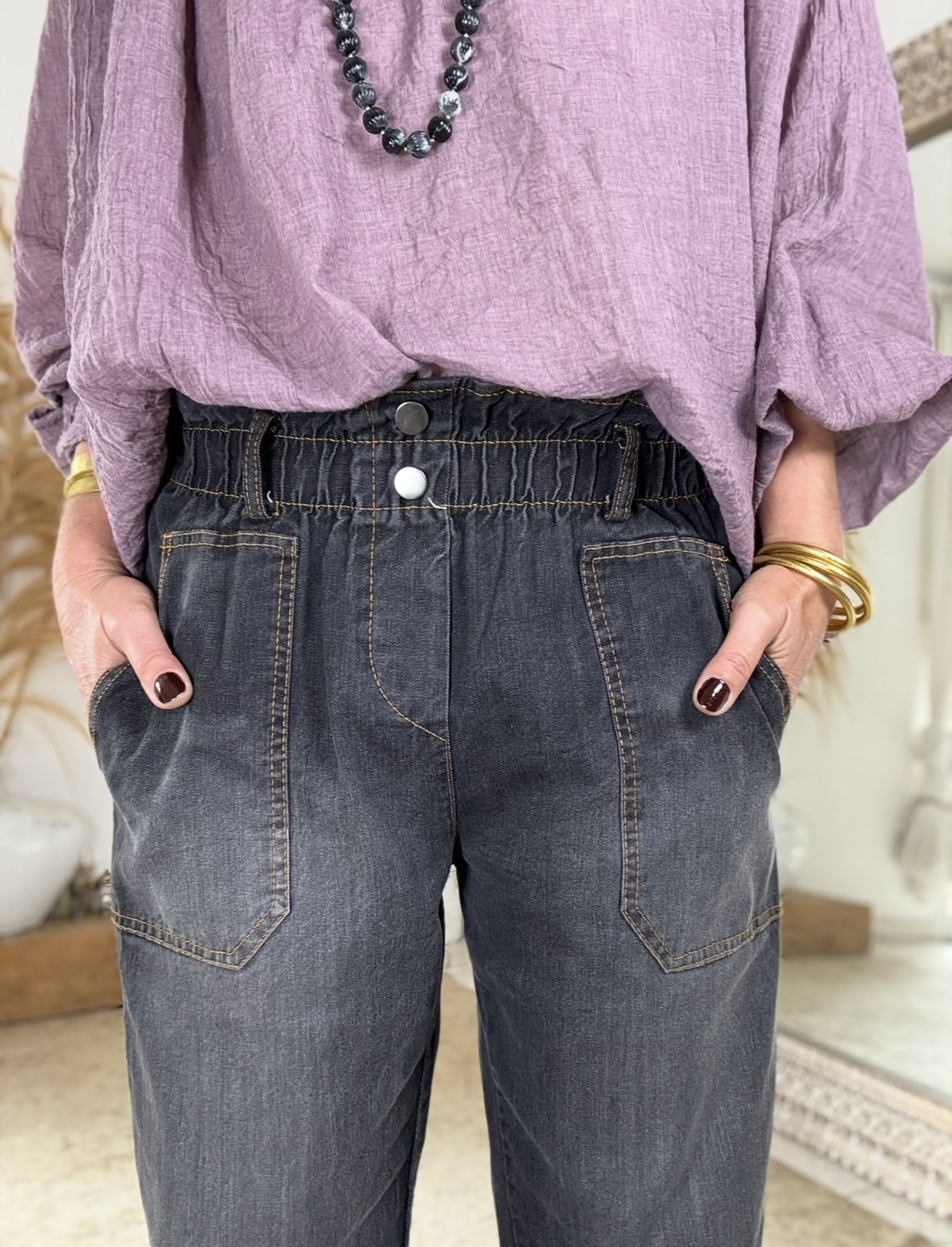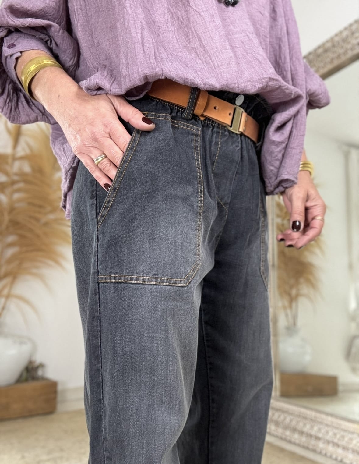 Pantalon magique en matière jean souple, coupe droite ample, taille élastique et bouton factice, coloris gris-noir délavé.Fabrication italienne. ( ceinture non incluse).