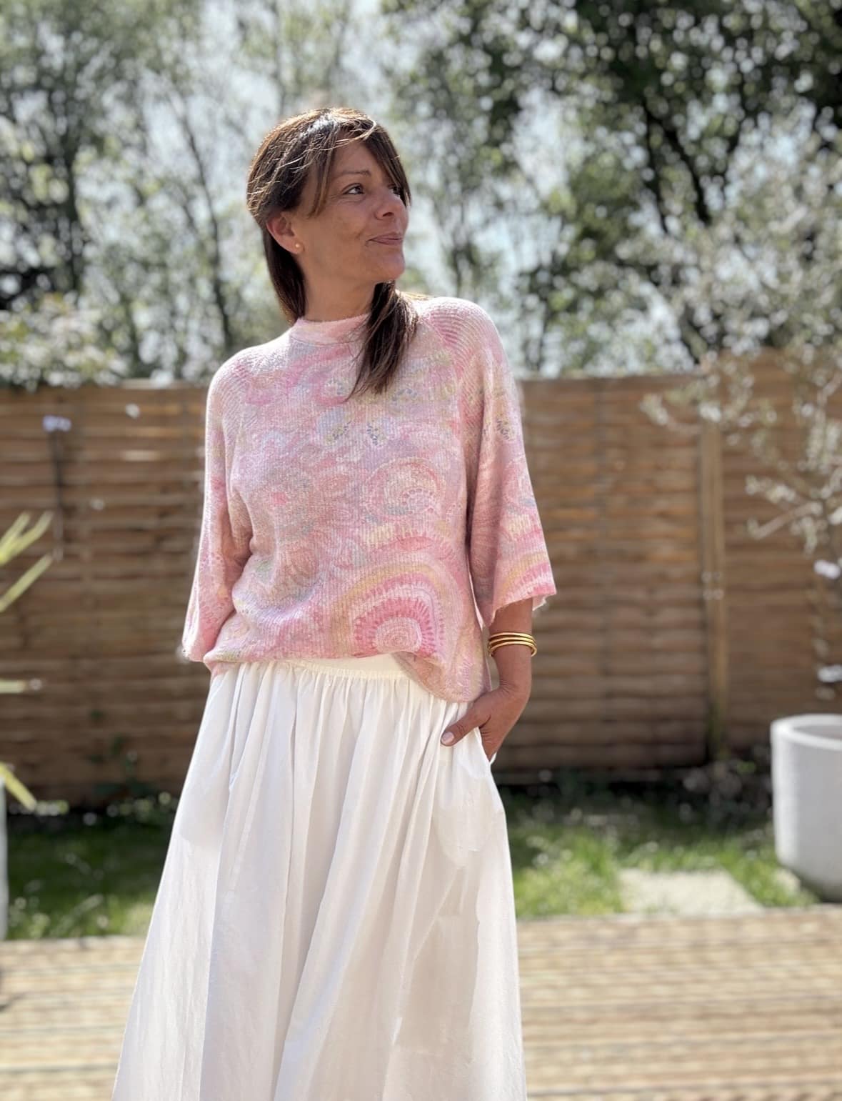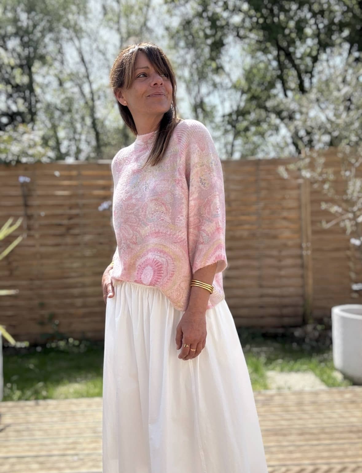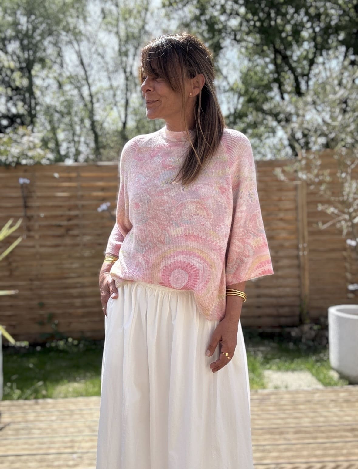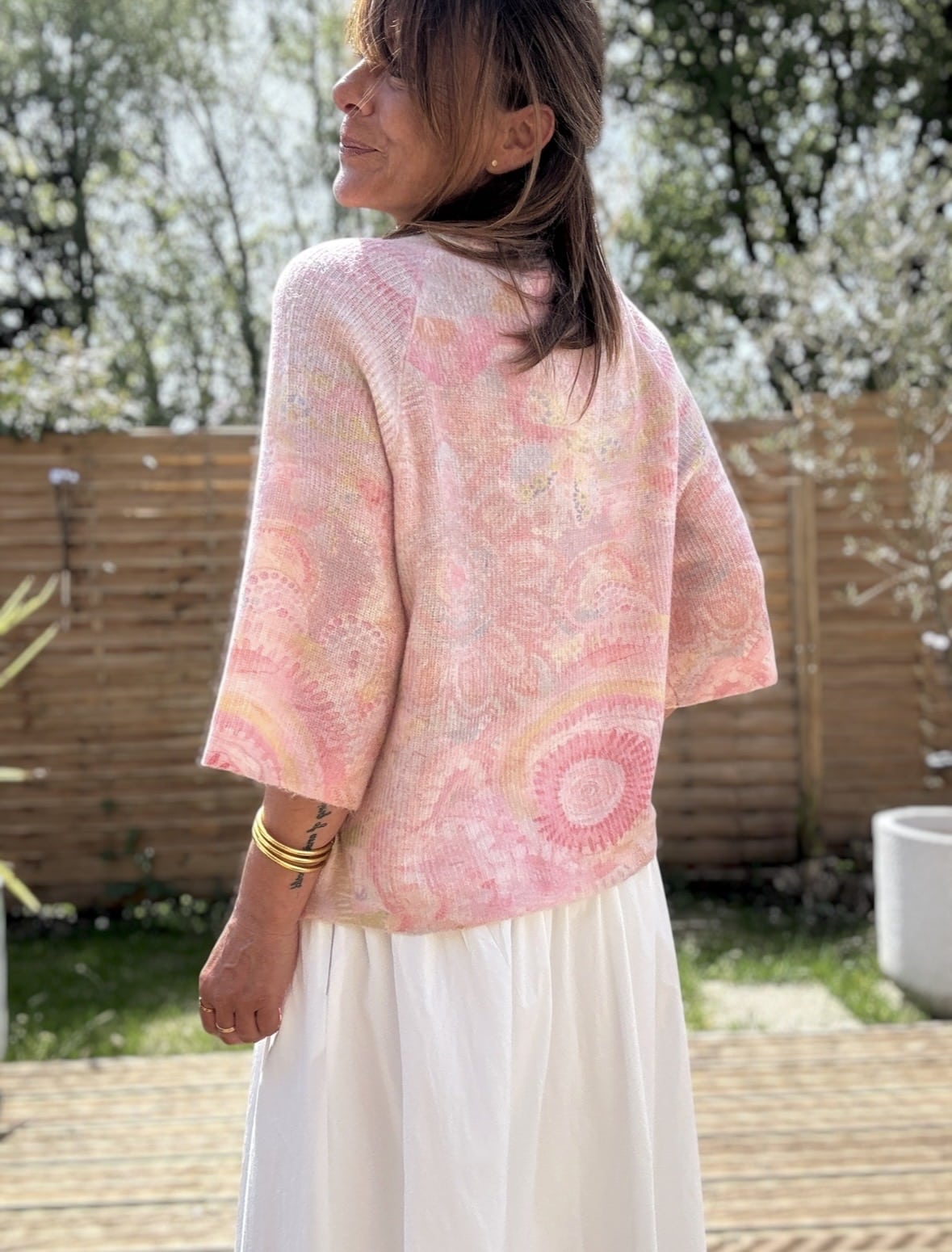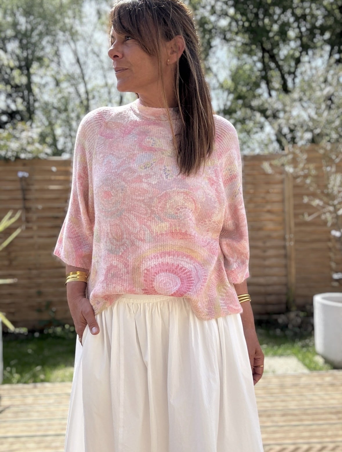 Pull Bohème en alpaga, doux et léger, aux motifs roses printaniers. Coupe droite, manches 3/4, fabrication italienne, style bohème chic.