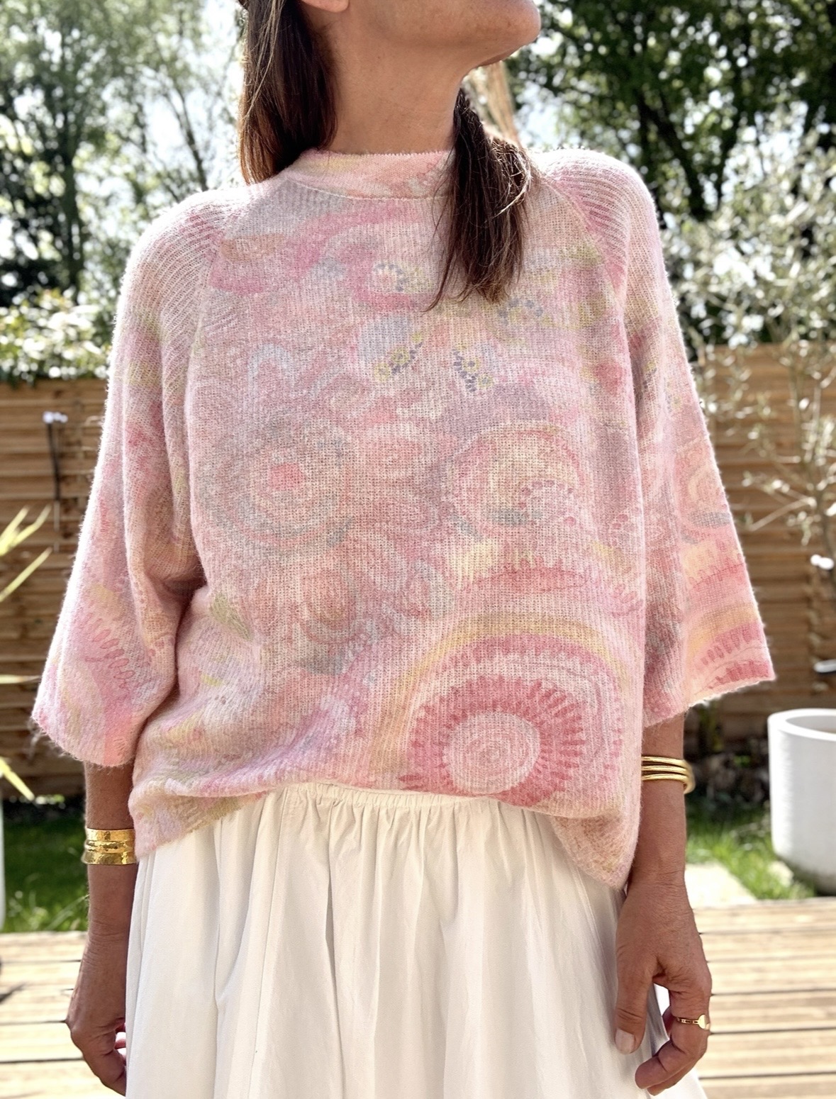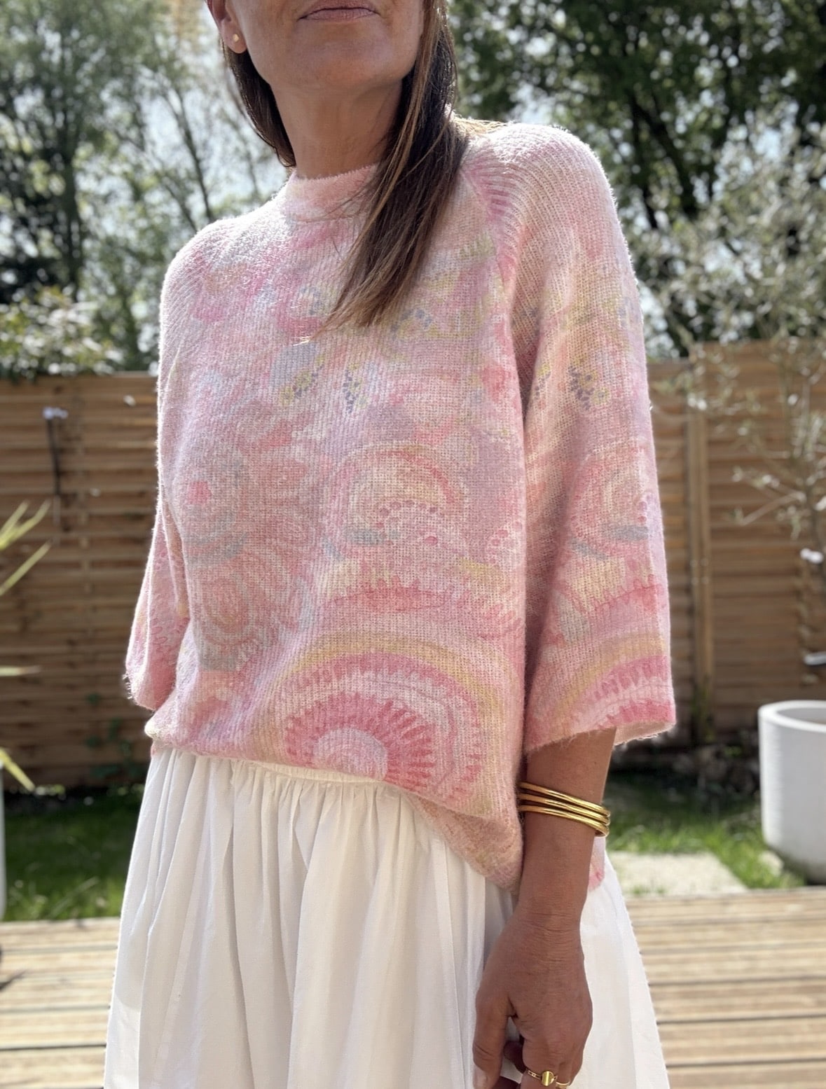 Pull Bohème léger fin et doux à dominante alpaga, motifs roses aux tons printaniers, coupe droite et manches 3/4. Fabrication italienne, taille unique 36-42. Très agréable à porter.