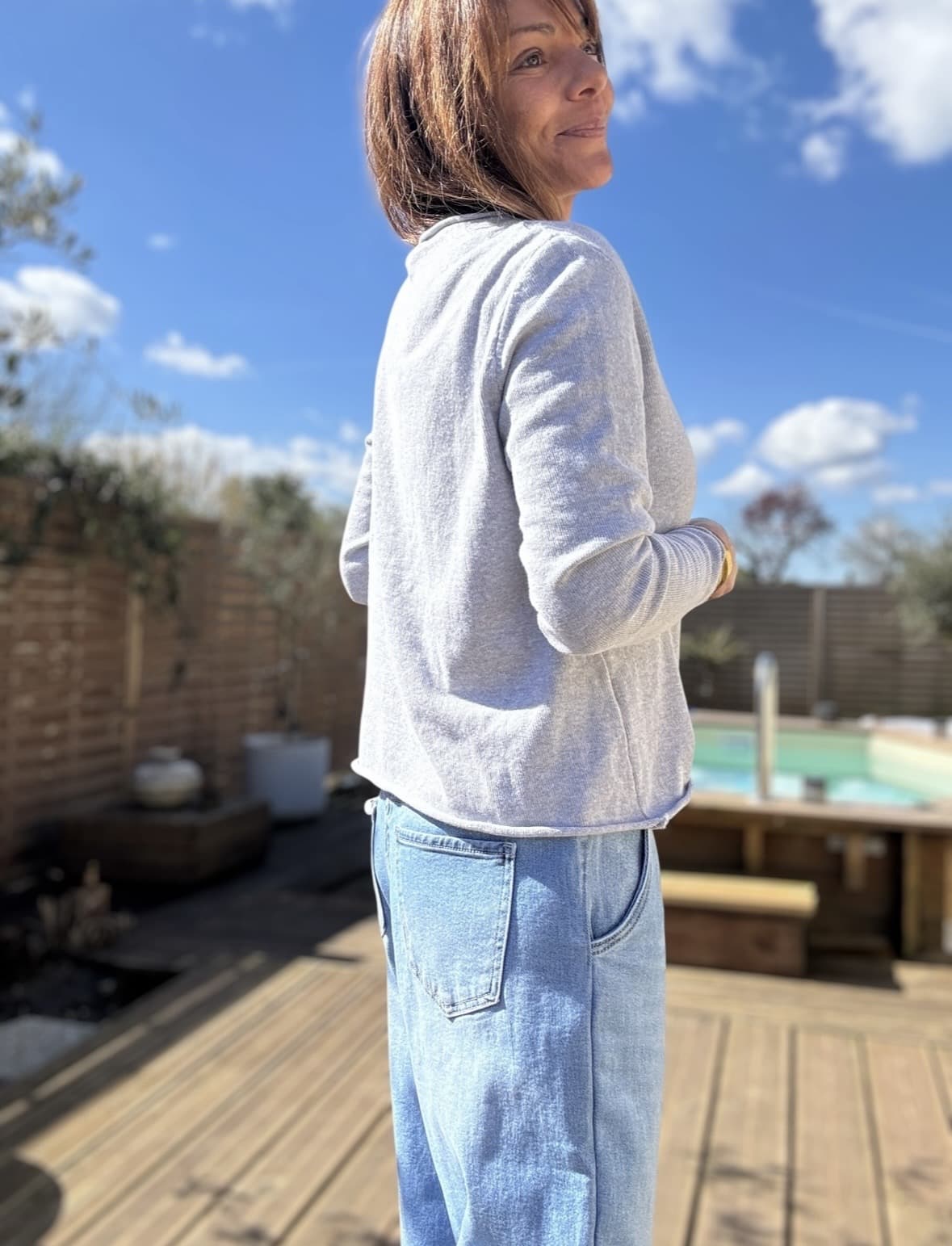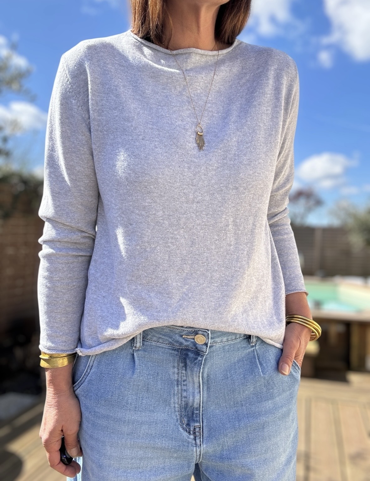 Pull NOA en coton gris clair, coupe droite avec col bateau et manches longues, dans une matière légère parfaite pour la saison printemps-été. Son tombé naturel et sa simplicité en font une pièce facile à associer au quotidien, notamment avec le jean TALYSSA pour un look moderne et décontracté. Fabrication italienne, taille unique convenant du 36 au 40.