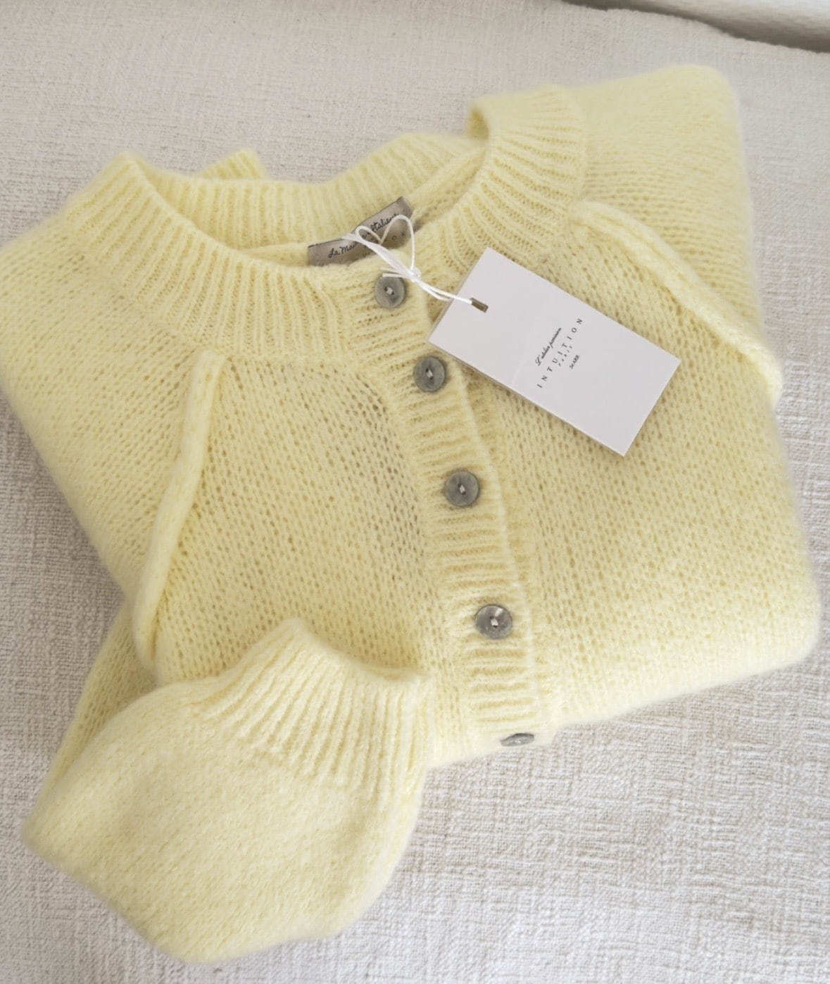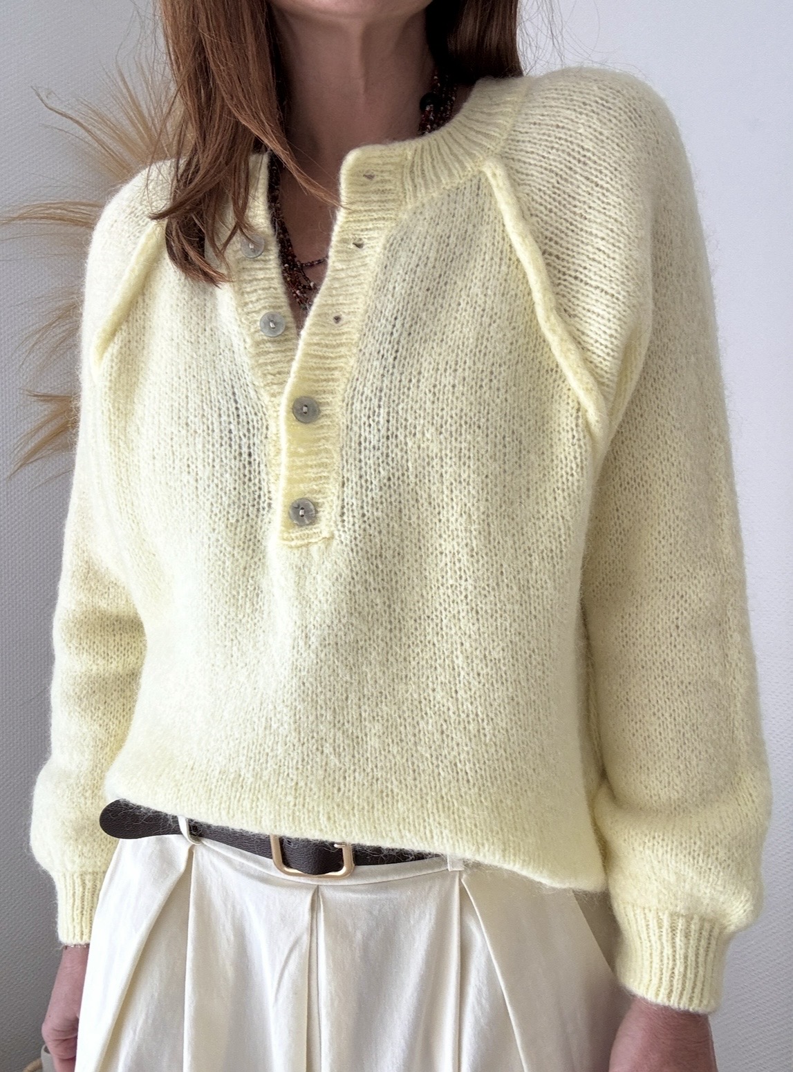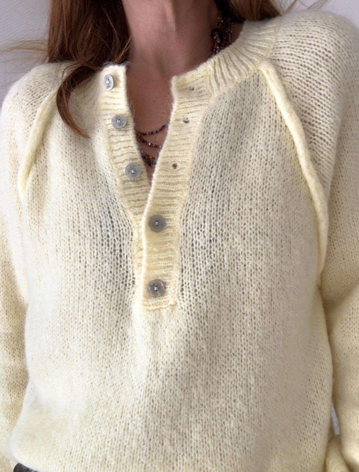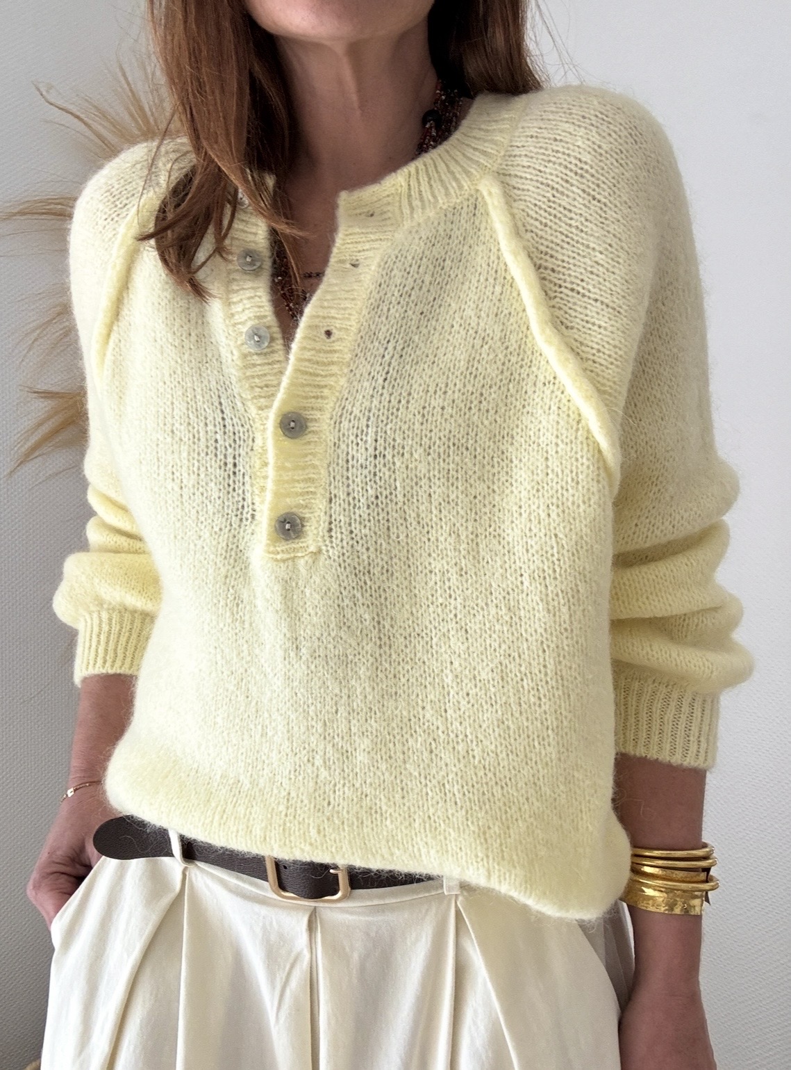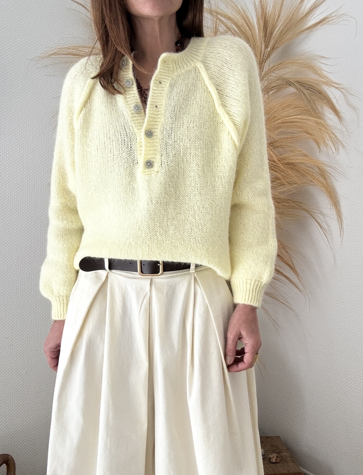 OLIVIER en jaune pastel, est un pull à la maille douce et moelleuse, principalement en kid mohair. Son décolleté boutonné apporte une touche féminine et élégante, tandis que ses manches raglan et sa coupe droite légèrement ample offrent un confort naturel et un joli tombé. Une pièce lumineuse et facile à porter au quotidien. Fabrication italienne. Taille unique convenant du 36 au 40.