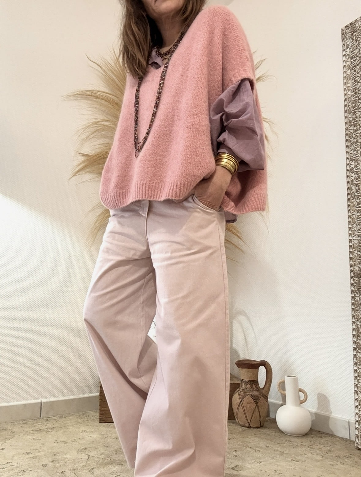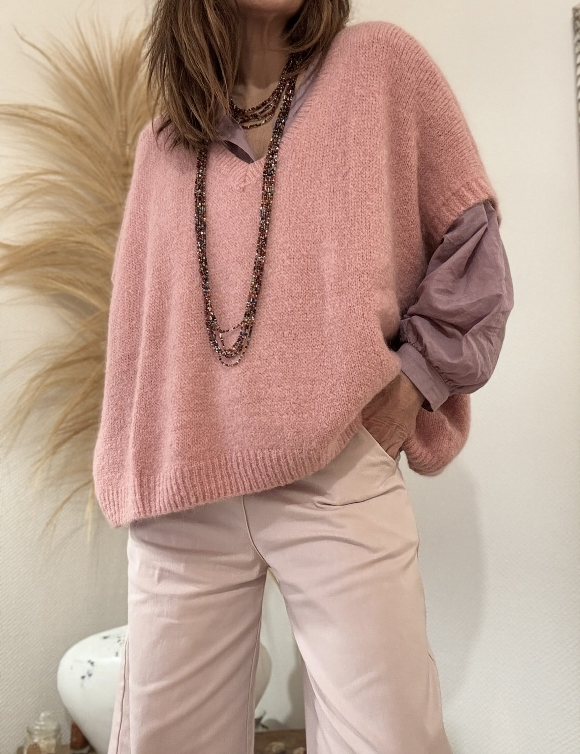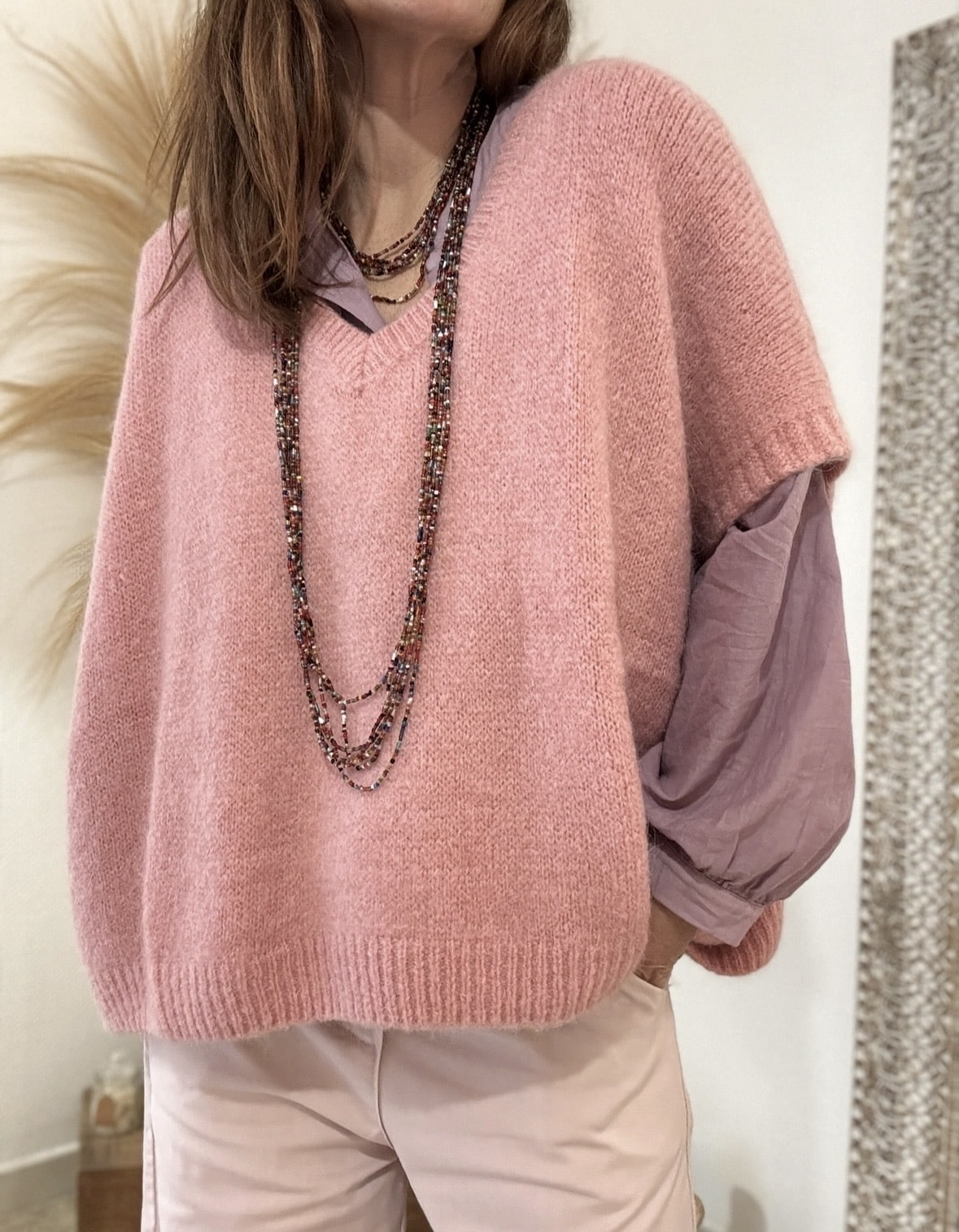 Le pull NOE, en version rose ancien. Maille douce enrichie en Kidmohair, coupe oversize et col V. Taille unique 36-44. Made in Italy.