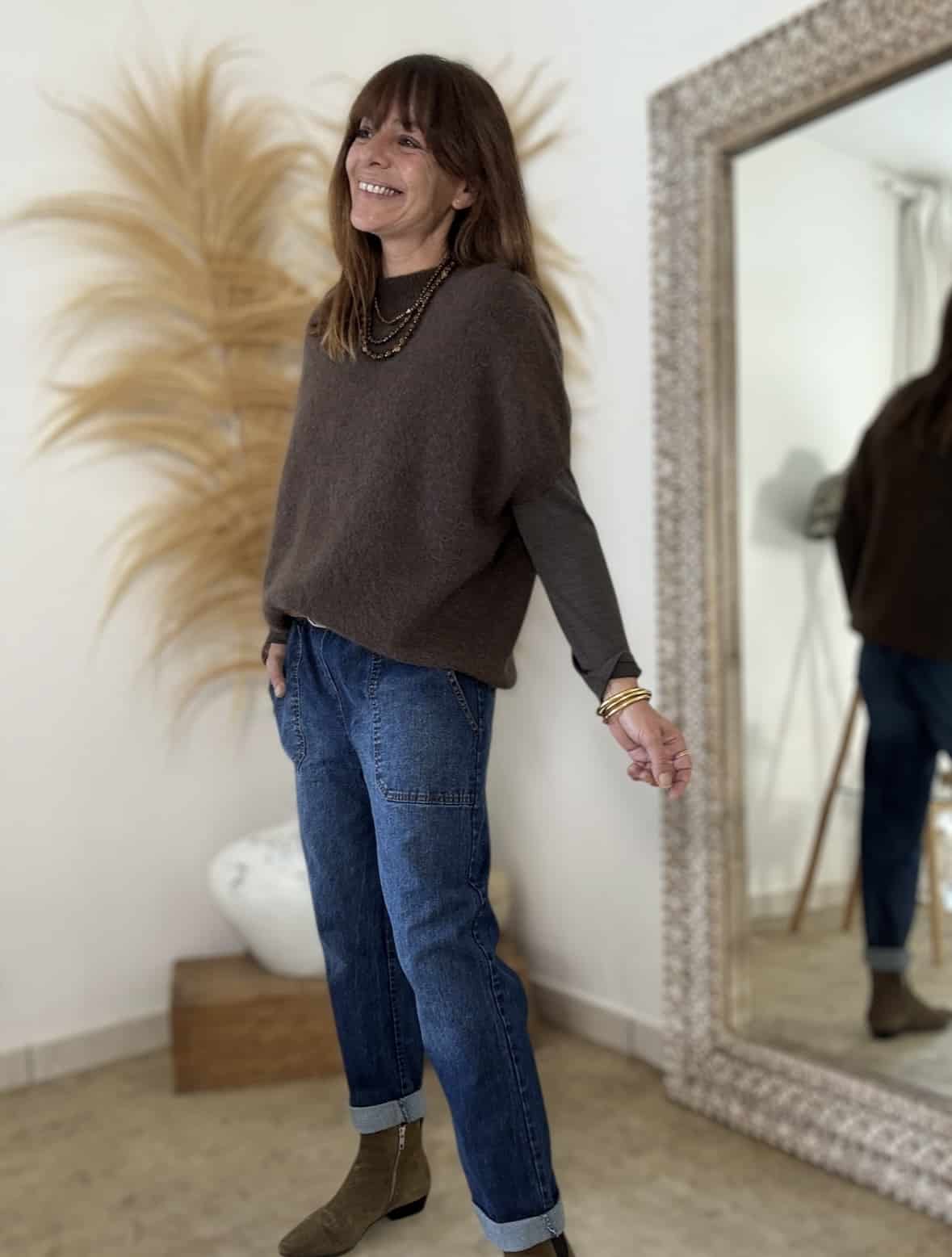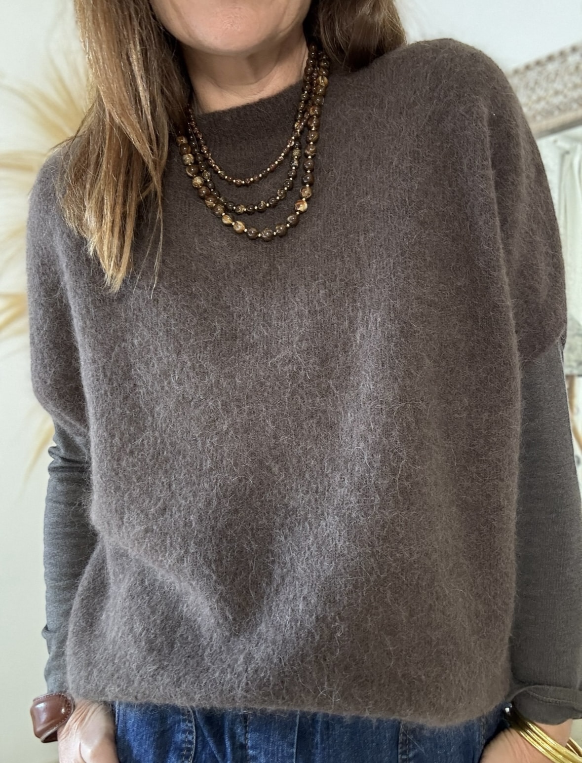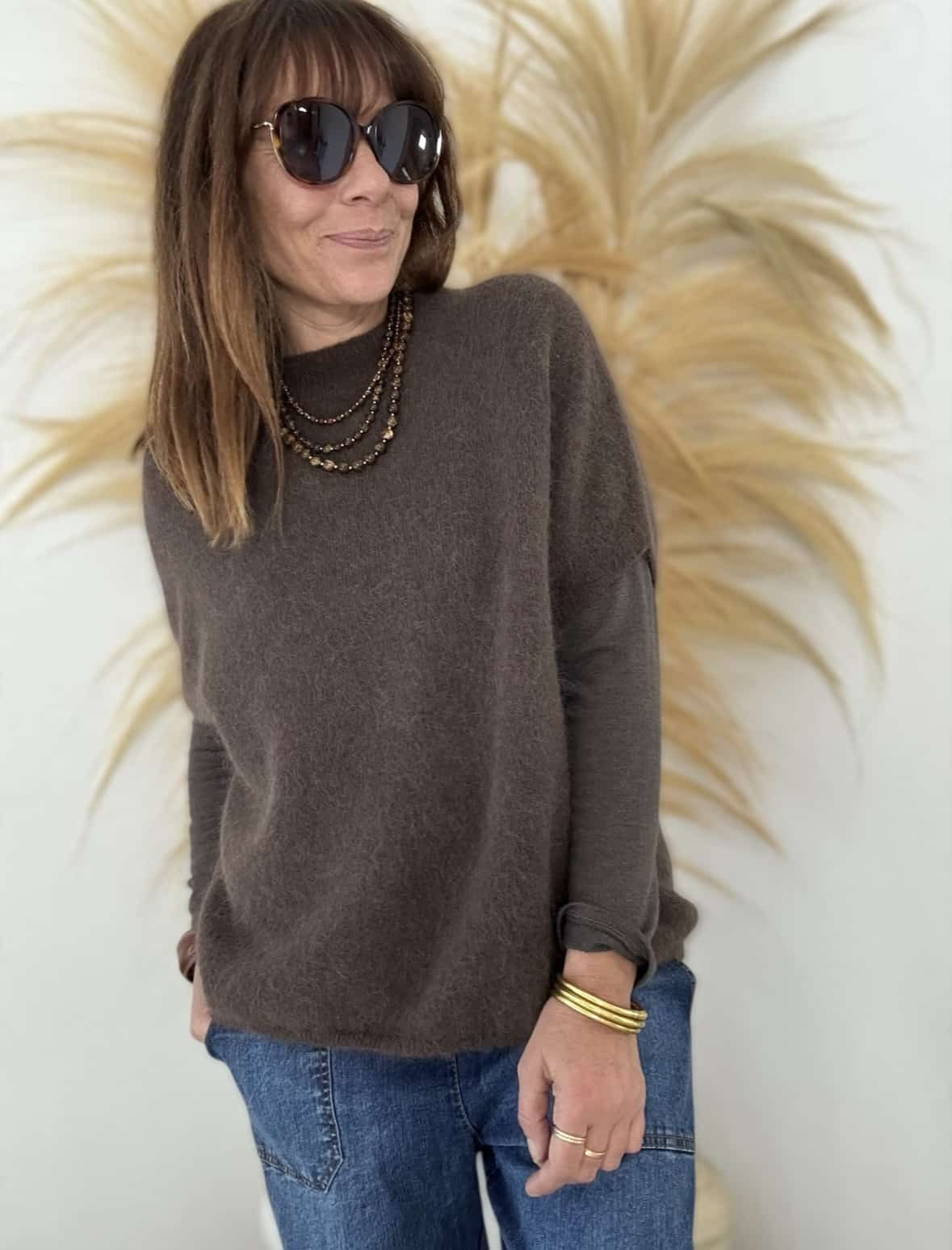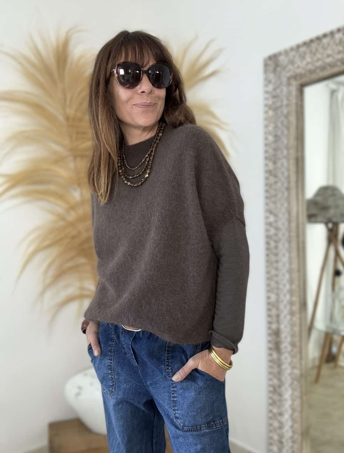 Pull Hathor chocolat, coupe ample et sans manche, col montant et douceur incroyable grâce à ses 45% de baby alpaga. Une pièce ultra cosy, chaude et élégante, parfaite en superposition. Taille unique (36–42). Magnifique couleur et fabrication italienne.