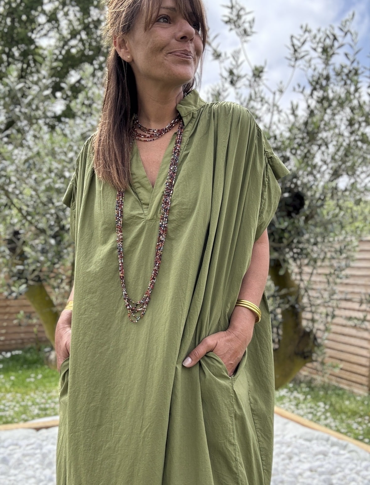 Robe longue oversize en voile de coton, manches courtes, col V, avec poches et ceinture amovible. Fluide, légère et fabrication italienne.