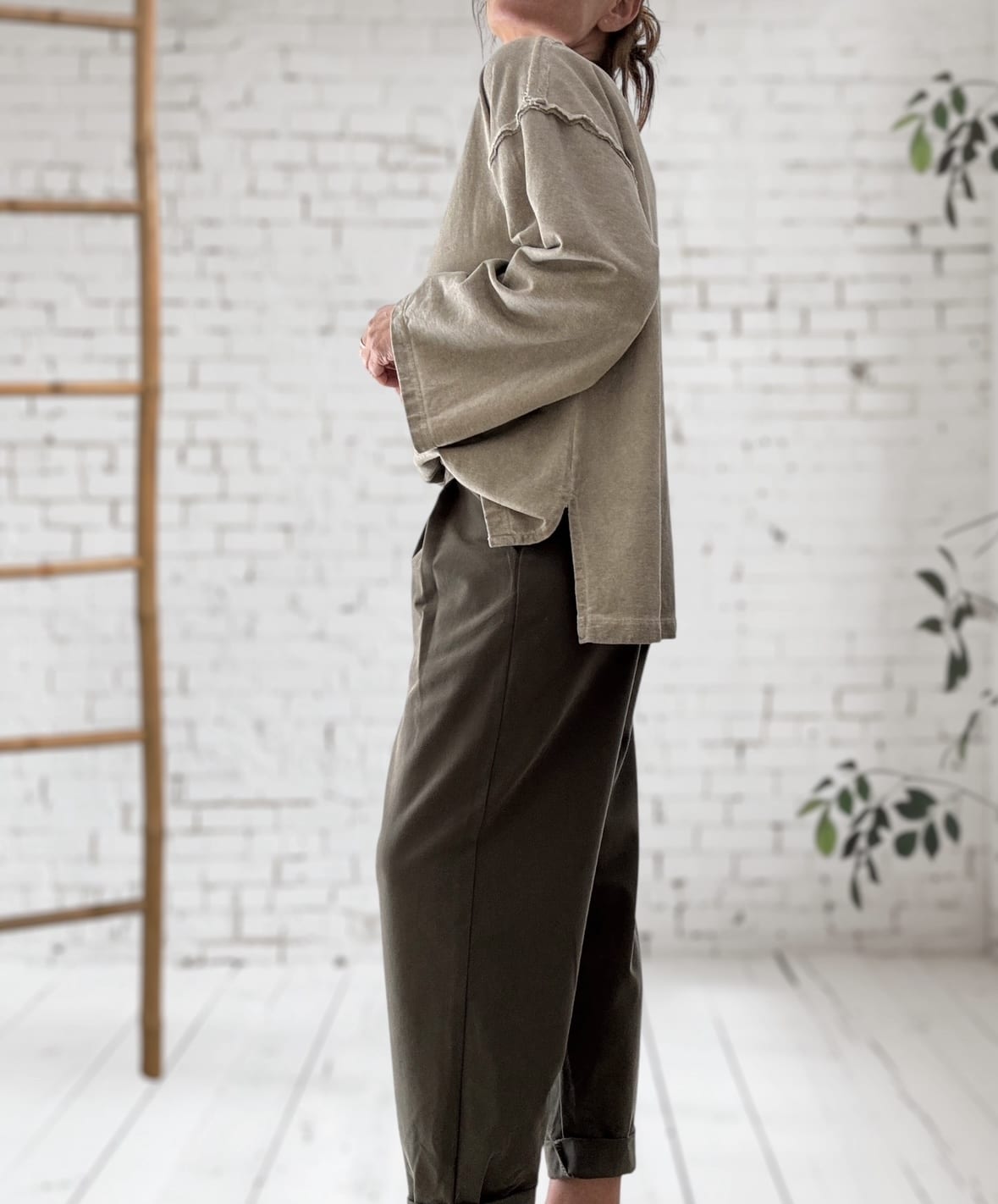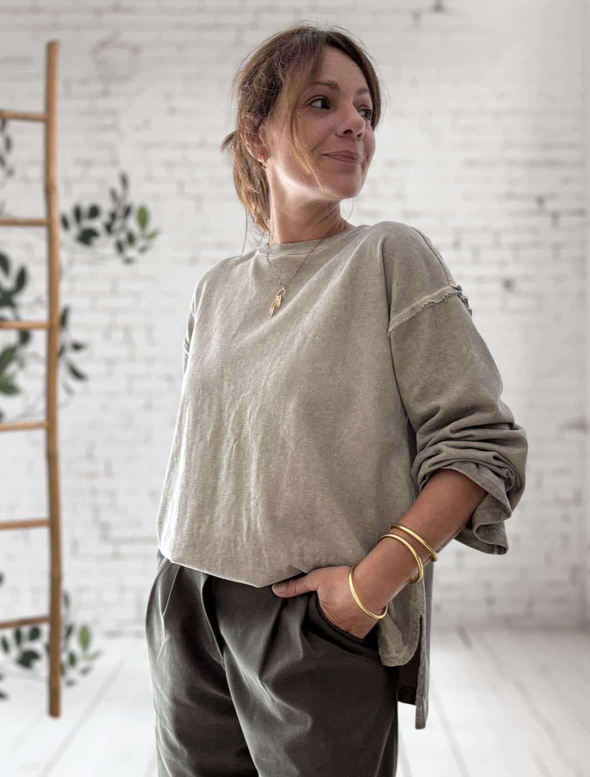 Associez-le le pantalon Ninou kaki pour un look casual. Portez-le aussi avec une jupe fluide pour jouer les contrastes. Plus vous mélangez les styles, plus il s’impose comme une pièce maîtresse. Et pour un effet harmonieux, combinez-le avec le pantalon de survêt beige délavé, il complète parfaitement le sweat. Ensemble, ils créent un total look confortable, moderne et élégant.