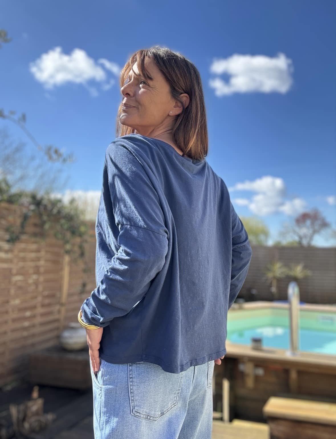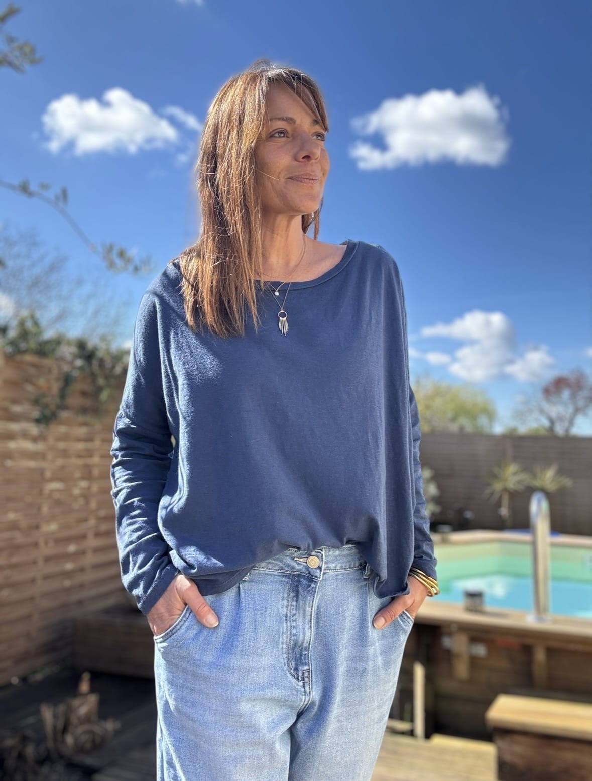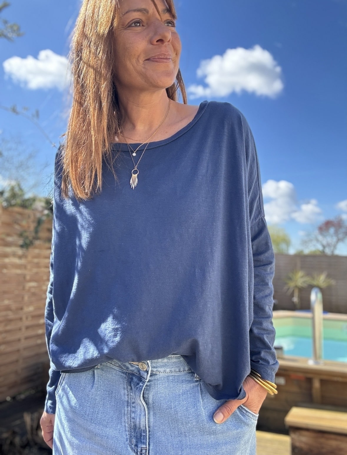 T-shirt LINO coupe oversize, col bateau et manches longues, en coton léger tout doux. Sa coupe fluide et son tombé naturel en font une pièce ultra facile à porter, à la fois décontractée et élégante. Il s’adapte à toutes les silhouettes et accompagne aussi bien un jean qu’une tenue plus habillée. Fabrication italienne, disponible en écru, maïs et marine. Taille unique convenant du 38 au 44.